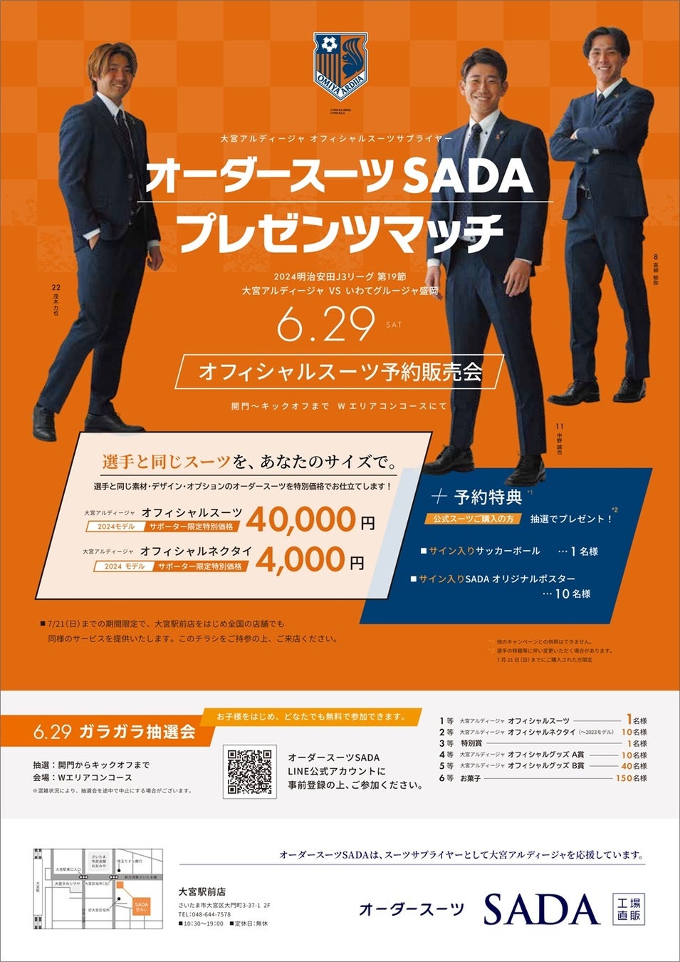 初回19,800円(税込21,780円)~オーダースーツを提供する株式会社オーダースーツSADA(本社:東京都千代田区、代表取締役:佐田展隆)は、2024年6月29日(土)に開催される『オーダースーツSADA プレゼンツマッチ オフィシャルスーツ予約販売会』にて、大宮アルディージャオフィシャルスーツの予約販売会をNACK5スタジアム大宮で実施いたします。オーダースーツSADAは、オフィシャルスーツサプライヤーとして大宮アルディージャを応援しています!