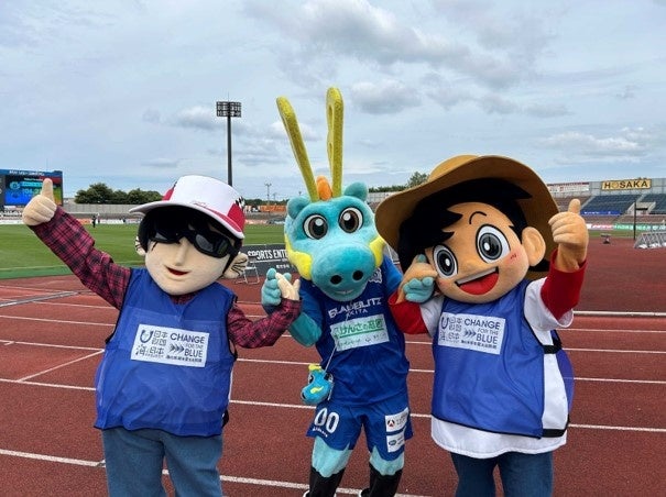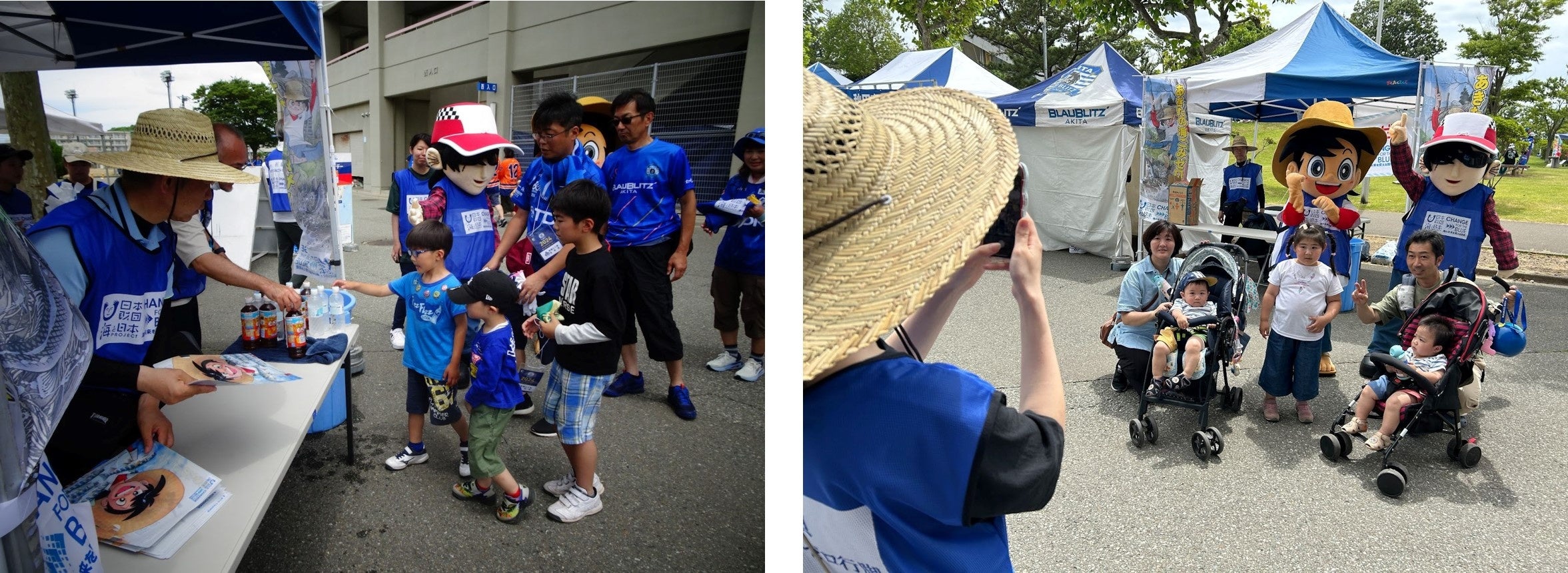 スタートからおよそ50分ほどで試合のあるスタジアムに到着しました。スタジアムではブラウブリッツ秋田のブラウゴン、あきた海ごみゼロプロジェクトの三平くんと魚紳くんがお出迎えし、試合間近のスタジアムピッチ脇に集まり、参加者全員で記念撮影を行いました。あきた海ごみゼロプロジェクトブースでは、サポーターの皆さんに、海洋ごみ削減をお伝えする活動の一環として、ごみ袋やチラシをお渡ししました。