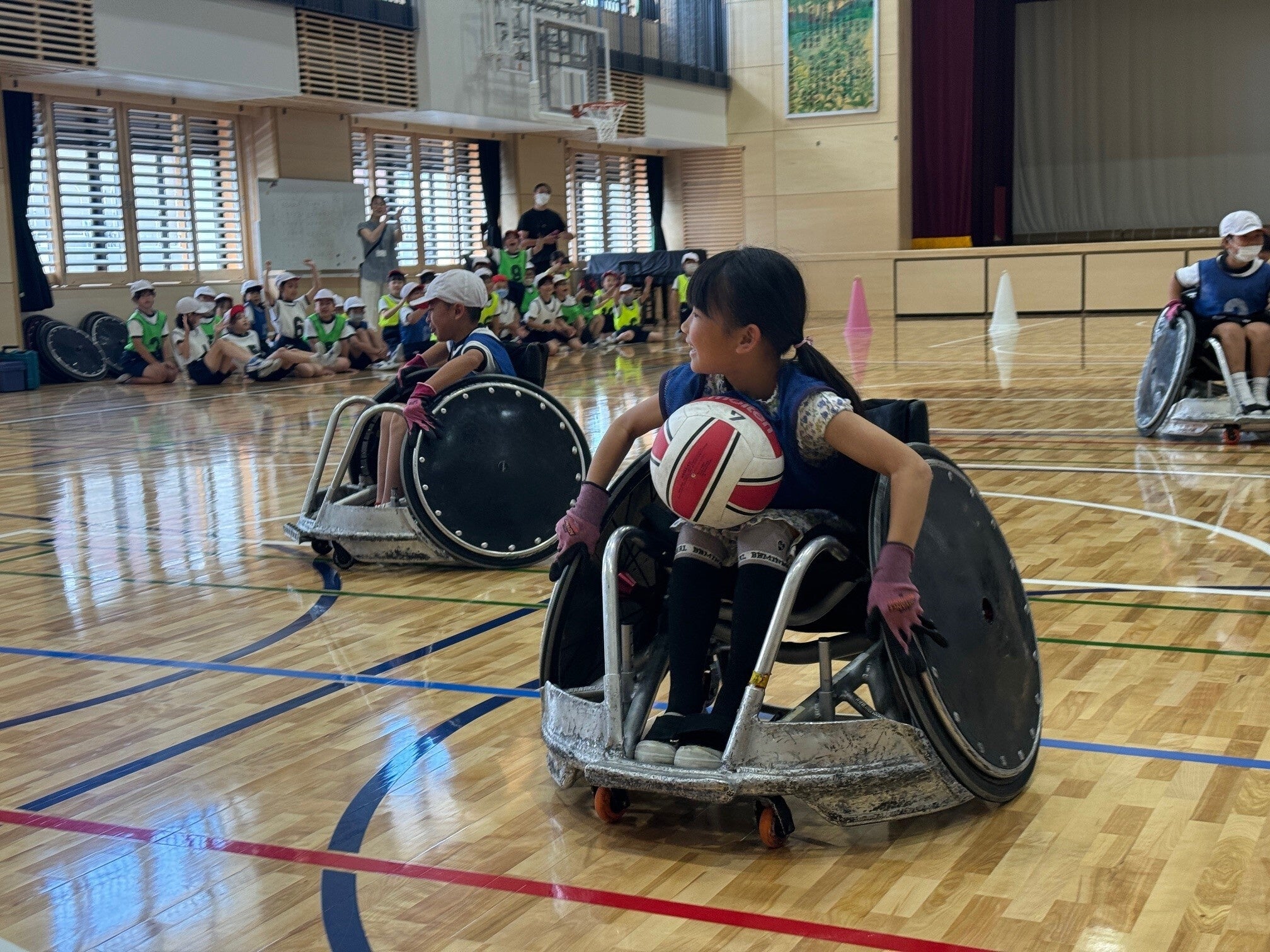 訪問初日となった6月24日にはパリ・パラリンピック日本代表候補、車いすラグビーの池崎大輔選手が小学校を訪問。実際に競技で使う車いすを使ったゲーム形式の授業を行い、車いすラグビーの魅力と、「強い気持ちをもって色々なことに挑戦することの大切さ」を子供たちに伝えました。