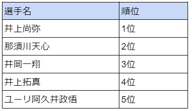 その他の順位を見てみると、2位「那須川天心」選手、3位「井岡一翔」選手、4位「井上拓真」選手、5位「ユーリ阿久井政悟」選手がランク入りしています。