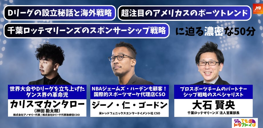イノベーションの力で新たなスポーツ・エンターテインメントを創造し、まだ見ぬ感動と熱狂を提供するアプリ「なんドラ」を運営する株式会社なんでもドラフト(本社:東京渋谷区、代表:森井啓允)は、「みる」「する」「ささえる」の 3 要素を主軸にスポーツの持つ価値と魅力の普及に取り組んできた株式会社JTB(本社:東京都、代表取締役 社長執行役員 山北栄二郎/以下「JTB」)との共催で、7月9日(火)にベルサール六本木で開催されるスポーツビジネスカンファレンス『Sports Business&Tech Summit 2024』の会場内で、パネルディスカッション『Dリーグの設立秘話と海外戦略、超注目のアメリカのスポーツトレンド、千葉ロッテマリーンズのスポンサーシップ戦略に迫る濃厚な50分!!』を開催します。