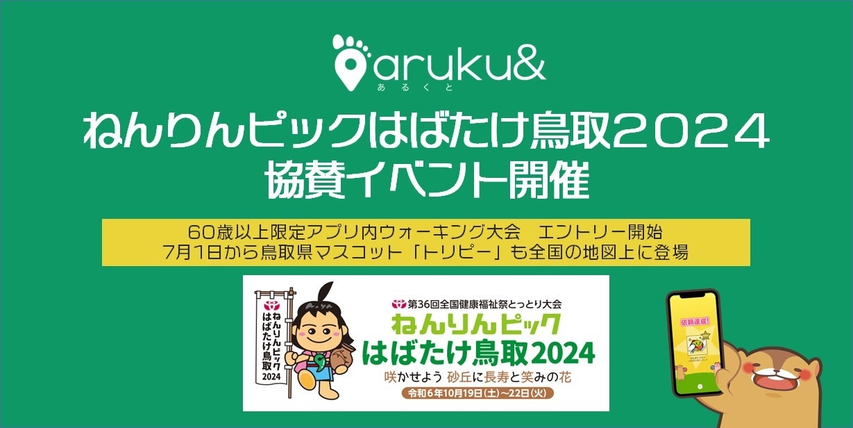 当社では、これまでもとっとり健康ポイント事業「あるくと健康!うごくと元気!」においてaruku&を活用いただくなど鳥取県民のみなさんの健康づくりを支援してきました。また、ねんりんピック開催を盛り上げるべく、大会PRキャラクター「あおや かみじろう」が2023年9月からaruku&内に登場しています。今回、当社では「ねんりんピックはばたけ鳥取2024」の開催趣旨に賛同し協賛することとなりました。「aruku&」のユーザー数は200万人を超え(23年12月現在)男女問わず利用されていますが、60代以上のユーザーも多く利用しています(※)。そこで、60歳以上のユーザー限定のオンラインウォーキングイベント「ねんりんピック ウォーキング on aruku&」を協賛イベントとして実施します。全国のユーザーとともに本大会を盛り上げてまいります。