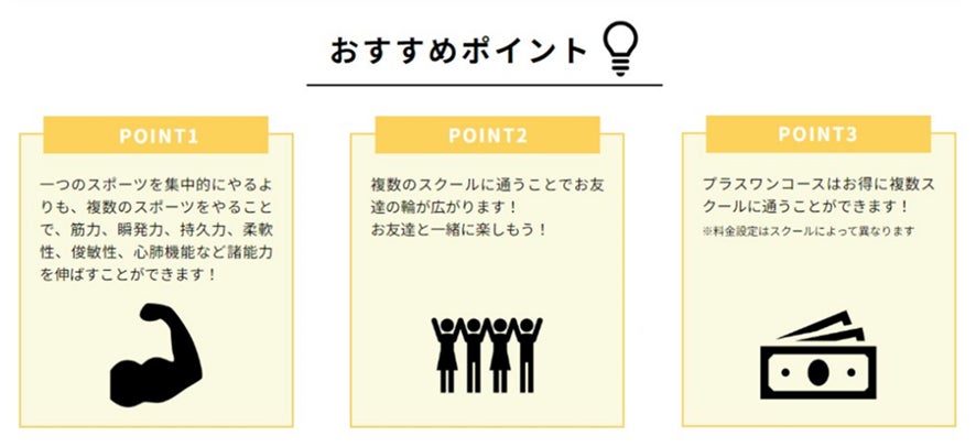 当社では、ひとつの種目のスクールに週1回通っていただく会員様がほとんどでしたが、中には週2回・週3回通っていただいている会員様がおり、会員様にもっと気軽にスポーツを楽しんでいただけるよう、より通いやすい「プラスワンコース」として展開することといたしました。