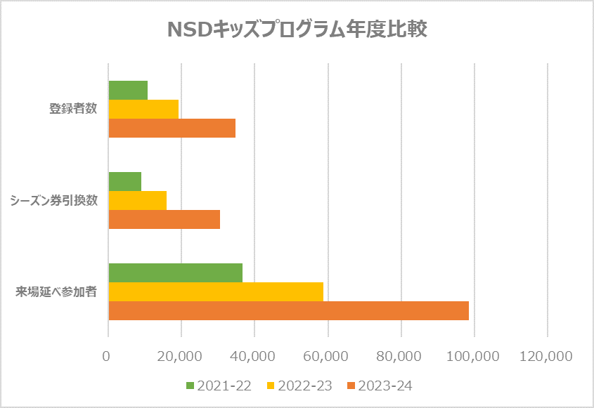 この度、2023-2024シーズン(11月~5月の7ヶ月間)において、NSDキッズプログラムの活動を含め、お子様の来場者数が、昨年に引き続き直近6シーズン最高値(※)の12万人を超えたことを報告いたします。