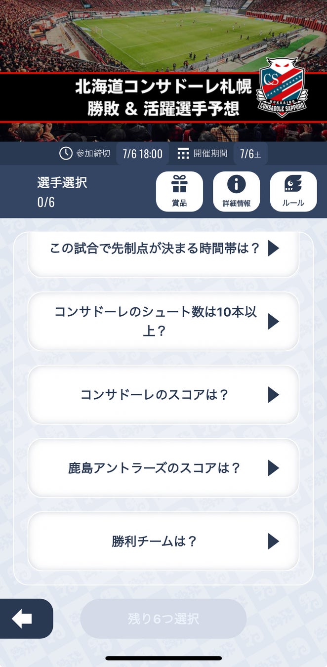 鹿島アントラーズ戦の試合展開・活躍選手を予想し、その成績1位〜5位の方5名様には、北海道コンサドーレ札幌の選手サイン色紙をプレゼントします。