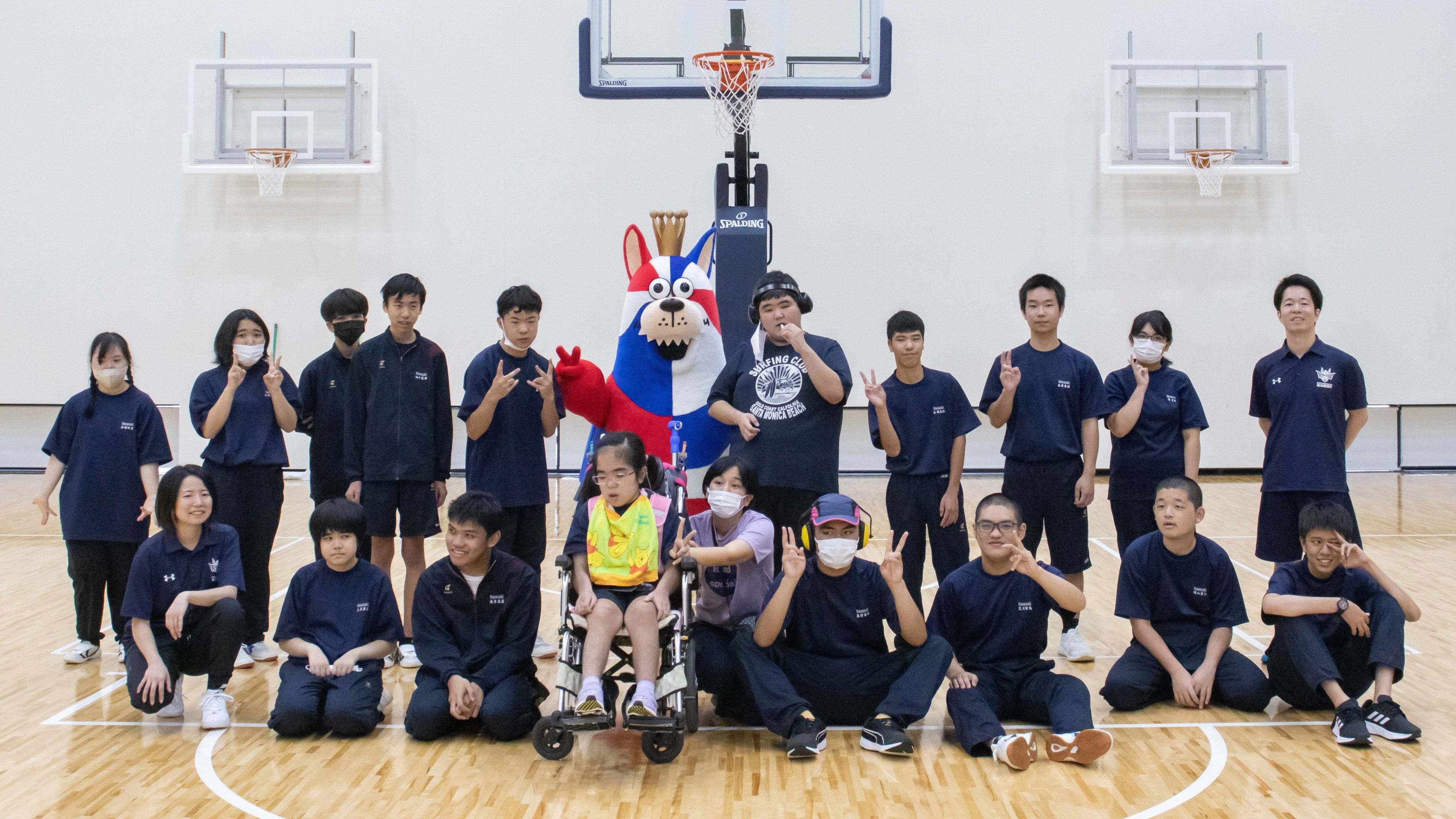 沖縄アリーナ見学では、最上階5階のパノラマラウンジから見るフロアや、スイートルーム見学、2階のキッズコンテンツ体験などを行いました。バスケ交流会では、チームの一体感を高めるを一体化するためのハドルを組んだり、グループでドリブルシュートを行い、行ったりなど、ゴーディーも応援に駆けつけ、生徒たちと交流しました。沖縄アリーナの魅力と、、体を動かすことやバスケットボールの楽しさを体験いただきました。