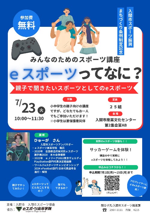 入間市(市長 杉島理一郎)は、令和6年7月23日(火)、入間市産業文化センターで、みんなのためのスポーツ講座「eスポーツってなに?~親子で聞きたいスポーツとしてのeスポーツ~」を開催します。