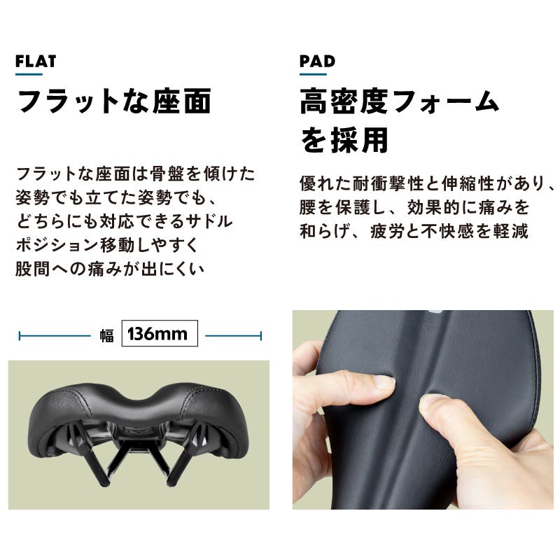フラットな座面は骨盤を傾けた姿勢でも立てた姿勢でも、どちらにも対応できるサドルです。