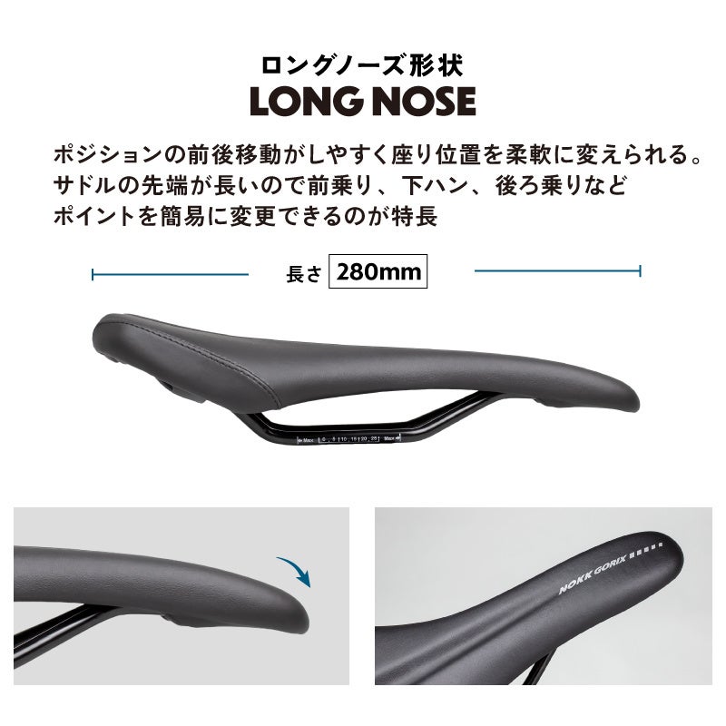 サドルの先端が長いので前乗り、下ハン、後ろ乗りなどポイントを簡易に変更できるのが特長です。