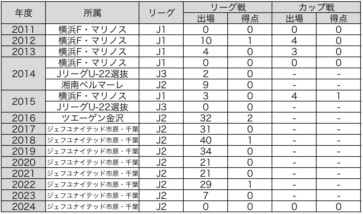 横浜F・マリノスプライマリー追浜 – 横浜F・マリノスJrユース追浜 – 横浜F・マリノスユース – 横浜F・マリノス – 湘南ベルマーレ – 横浜F・マリノス – ツエーゲン金沢 – 横浜F・マリノス – ジェフユナイテッド千葉 – 横浜F・マリノス – ジェフユナイテッド千葉