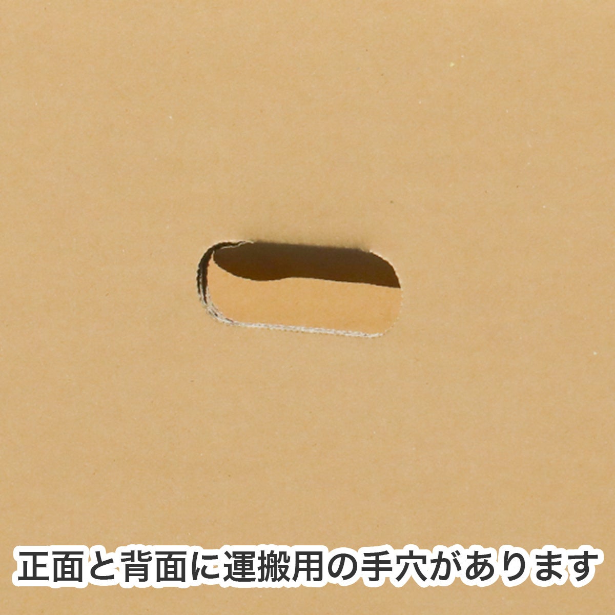 運びやすさを考慮し、持ち手穴を正面と背面に設けているダンボール箱となります。持ち手穴の位置は、面に対して中央配置が一般的ですが、本商品は自転車用の大型ダンボール箱ということもあり、両手で持ち運びやすいように位置を調整して設計いたしました。持ち運びの際にはぜひご活用ください。