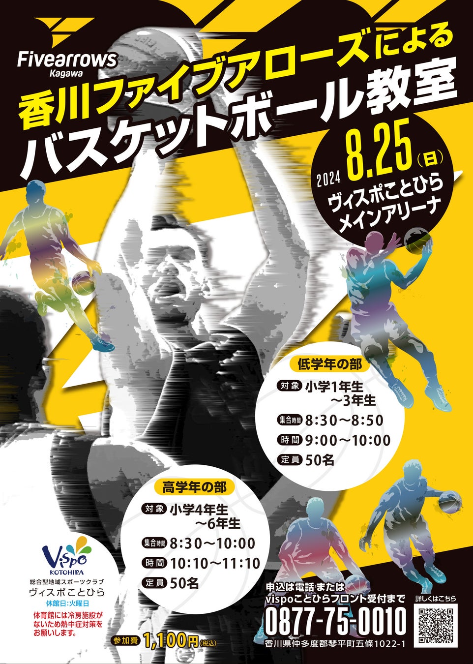 8月25日(日)、「総合型地域スポーツクラブ ヴィスポことひら」にて、小学生高学年・低学年を対象としたバスケットボール教室を開催しますのでお知らせいたします。