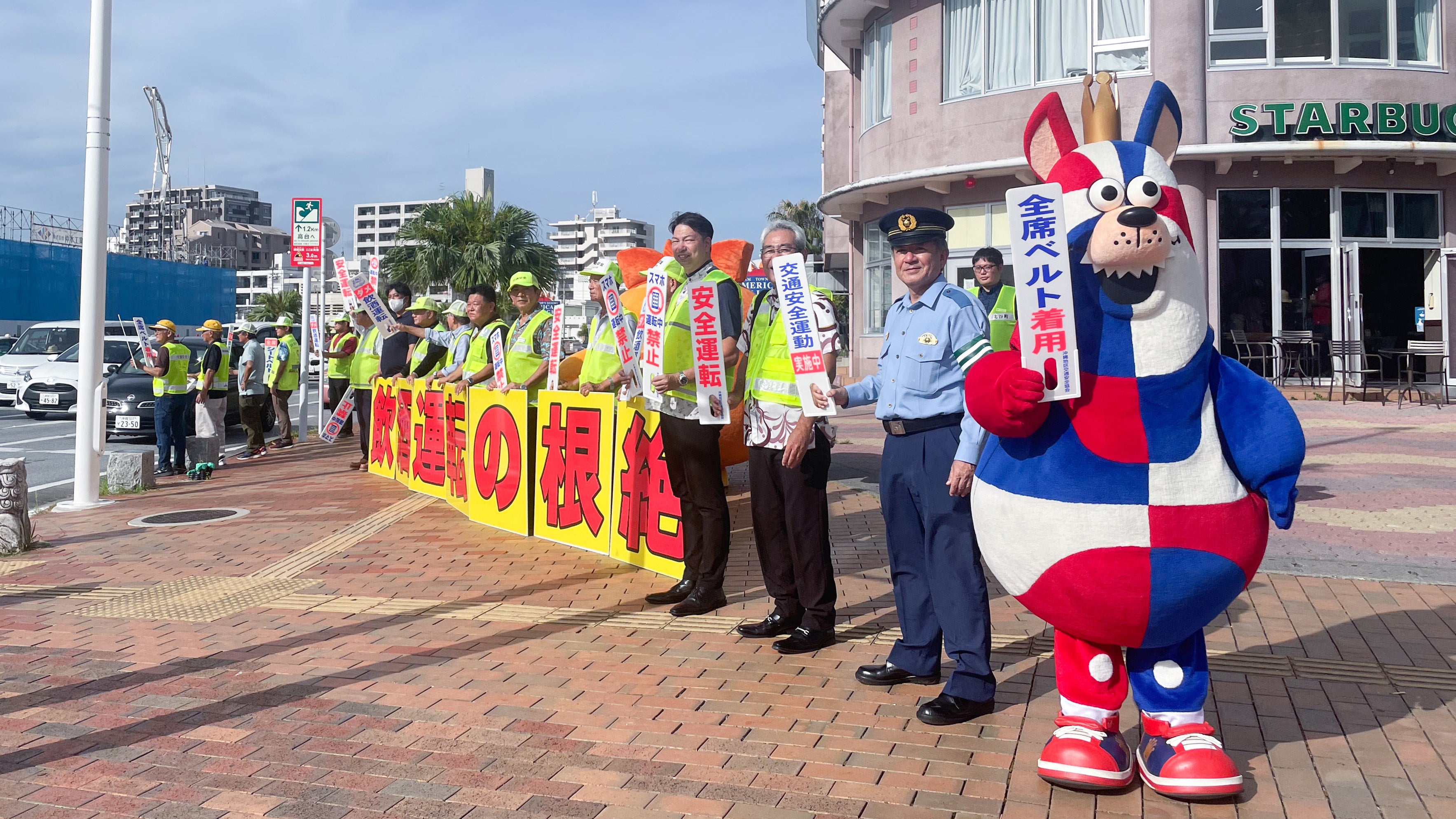 出発式終了後には、沖縄警察署長 金城重成氏をはじめ、交通安全指導員らと共に美浜メディアステーション先交差点にて「アイキャッチ運動」が行われ、北谷町イメージキャラクター「ちーたん」とゴーディーがドライバーや通行人に向けて、「飲酒運転撲滅」や「全席ベルト着用」などのボードを掲げ、交通安全の呼びかけや、チラシ配布を行いました。