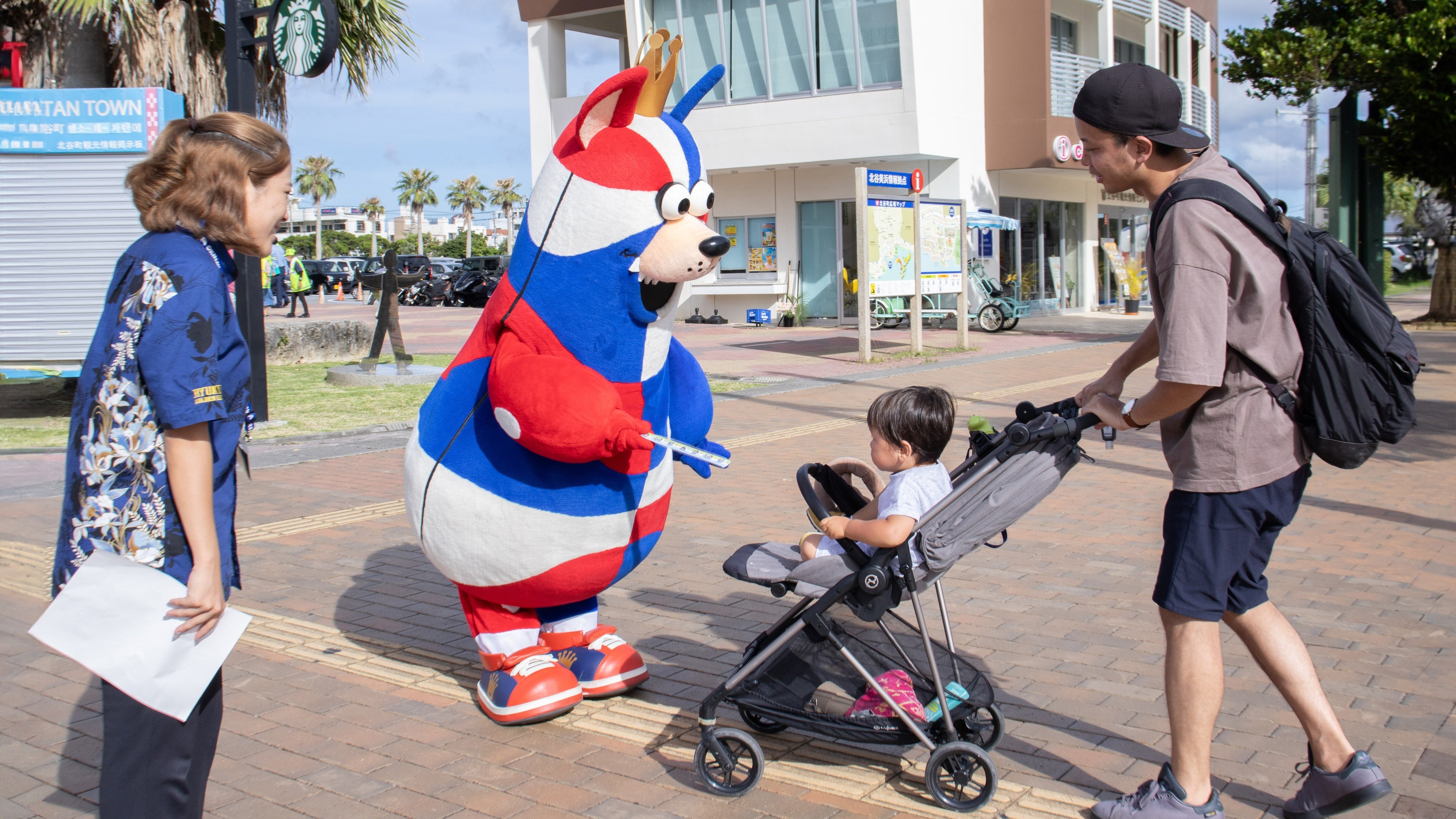 当日は、沖縄市市民部次長 宮城光秀氏、北谷町長 渡久地政志氏、北中城村長 比嘉孝則氏をはじめ、各市町村の交通安全推進協議会関係者や沖縄警察署員、北谷町イメージキャラクター「ちーたん」が参加したほか、美浜保育所の園児によるパフォーマンスや交通安全宣言があり、交通事故防止の呼びかけにゴーディーが応援に駆けつけました。