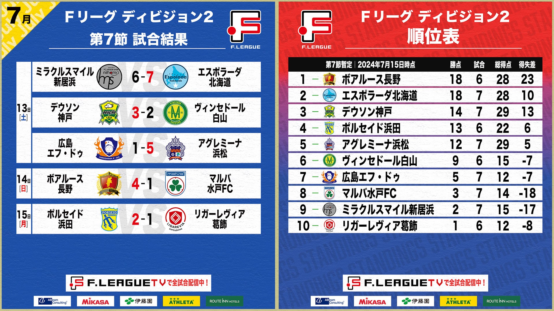 7月13日(土)〜15日(月・祝)の3日間で実施されたFリーグ2024-2025 ディビジョン2 第7節の5試合について結果をお知らせいたします。
