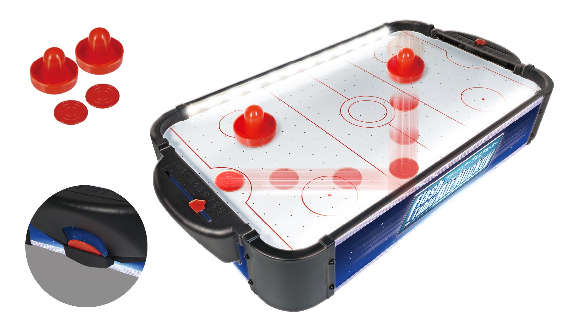 特徴:大迫力のビッグサイズ!両サイドにライトがピカッと点灯し、パックが浮くエアファン付き!そして得点板もあるから勝負がもっっと楽しくなる♪お家で白熱バトルを繰り広げよう!