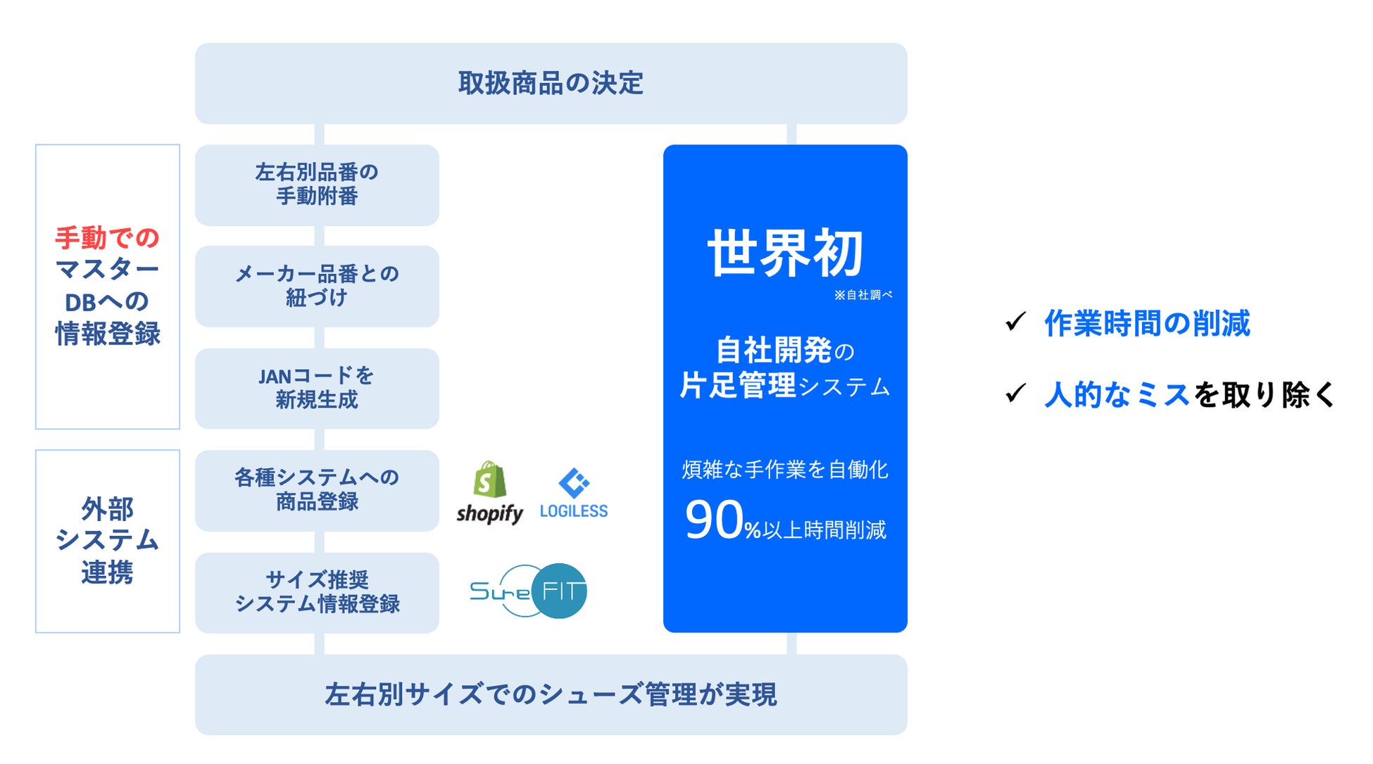 我々の知る限り、市場にある両足で流通しているシューズを左右別々の片足品番として管理するシステムは他にみたことがありません。