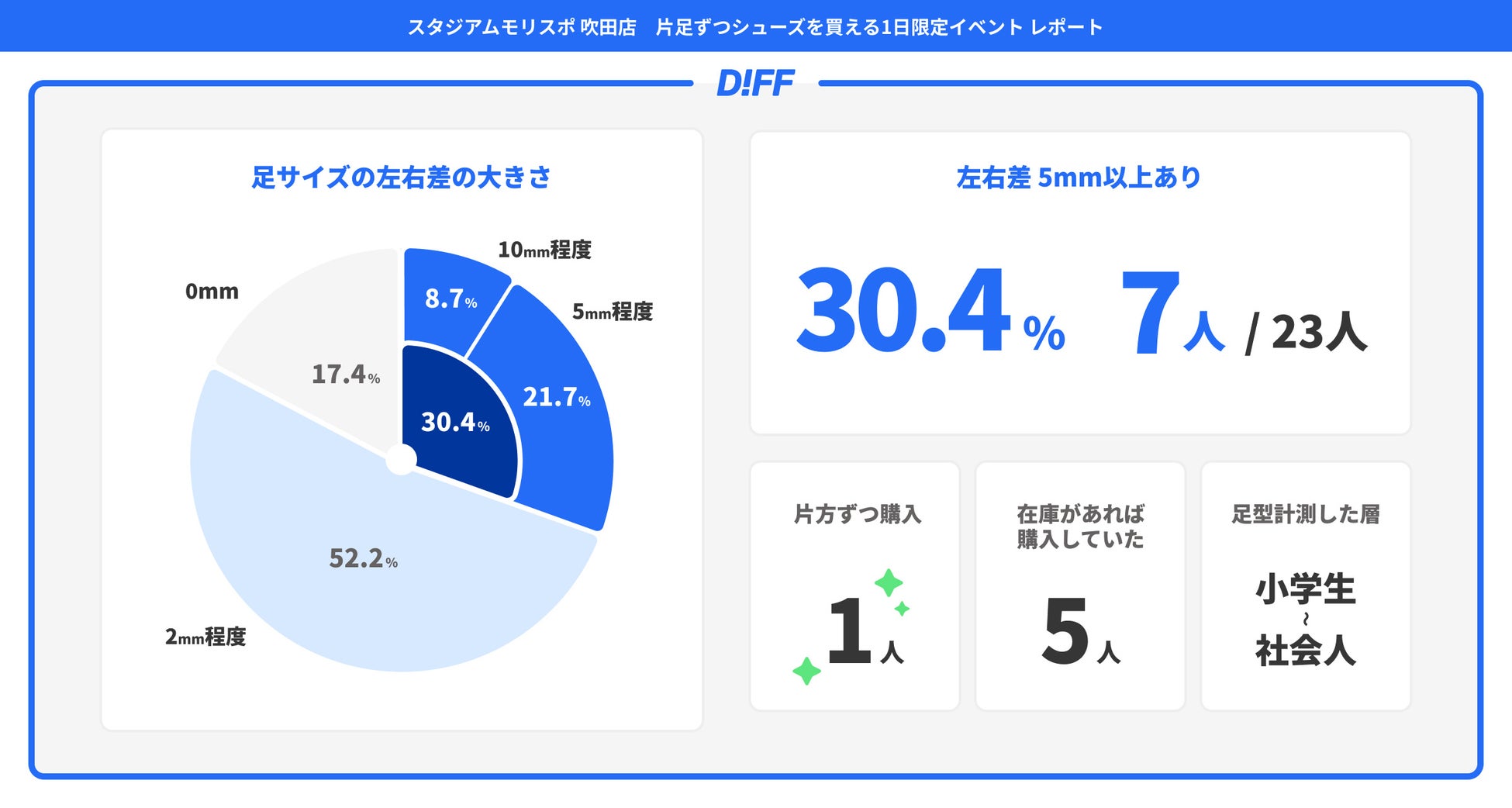上記の通り、当社では足型計測会や専門家取材を通して、「足のサイズの左右差を抱えて課題を感じている人(顕在層)」「足のサイズの左右差を抱えてリスクを抱えている人(潜在層)」の存在とリスクを明らかにしてきました。スタジアムモリスポを訪れるお客さまの中にも一定数当てはまる層が来店されることがあると聞き、今回の実施を具体的に検討し始めました。