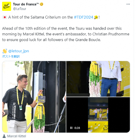 現地では、ツール・ド・フランスに出場する選手達の安全と健康、大会の成功を祈念した「千羽鶴」を大会アンバサダーのマルセル・キッテル氏からA.S.O.の大会ディレクターに贈呈しました。千羽鶴は、4月から6月の期間に、各種イベントに出展した大会のPRブースにお越しいただいた皆様や、さいたま市内の小学校と教育相談所の皆様に折っていただいた折り鶴をまとめて、千羽鶴として完成させたものです。