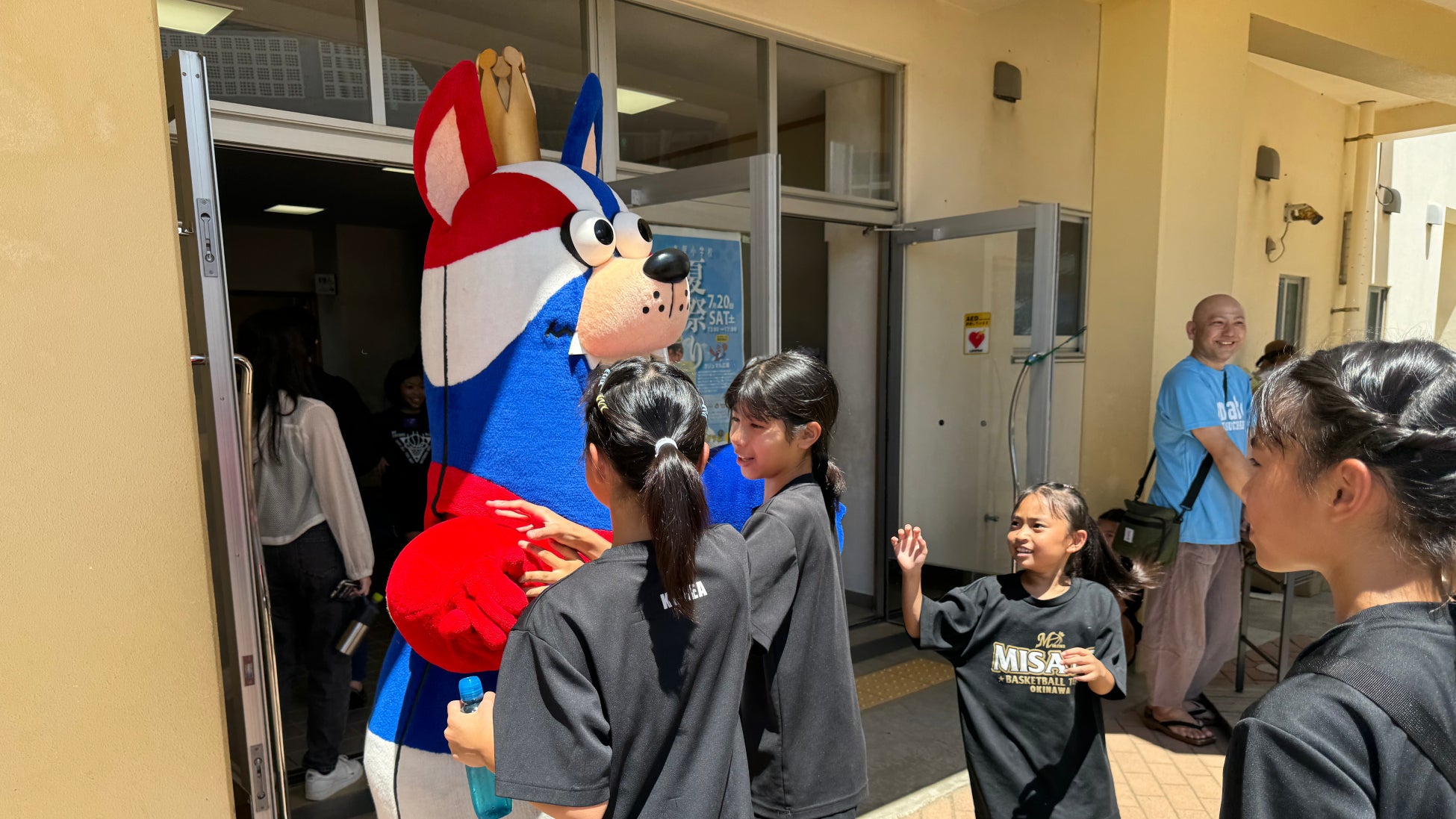 7月20日(土)には、ホームタウン沖縄市にある美里小学校で行われた「美里小学校夏祭り」に参加しました。夏祭りの開会式にはゴーディーがサプライズで登場し、オープニングアクトを務めた新体操チームの子どもたちの演舞や音楽委員会の演奏にも飛び入り参加し、会場を盛り上げました。