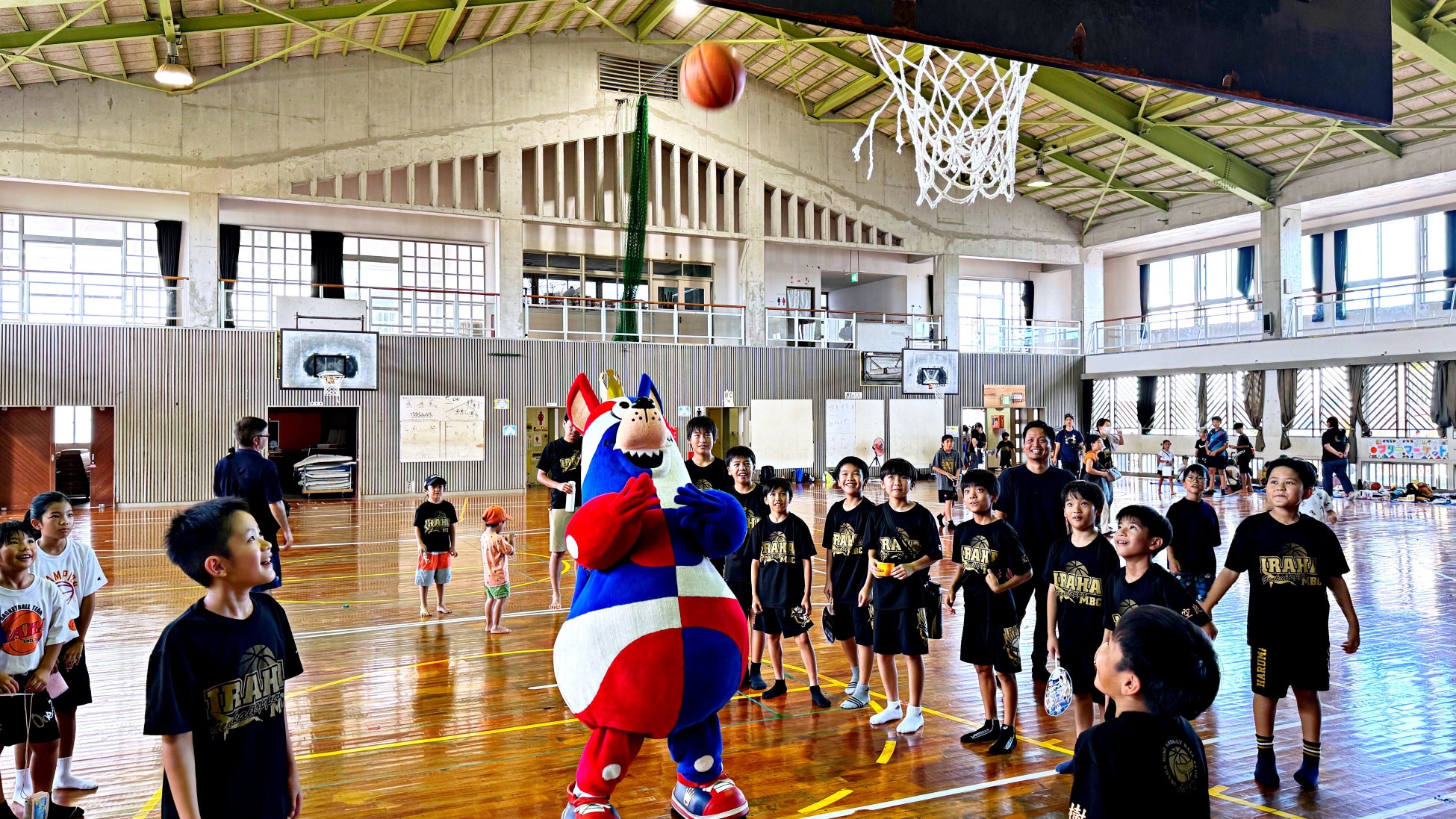 また、同日に豊見城市の伊良波小学校にて行われた「いらはっこまつり」に参加しました。「いらはっこまつり」では、各部活動やクラブからの出店などがあり、伊良波小学校の男女バスケットボール部の子どもたちにお祭りを案内してもらいながら、フリースロー対決やストラックアウト、キックボーリングなどを体験し、地域の皆さまと交流しました。