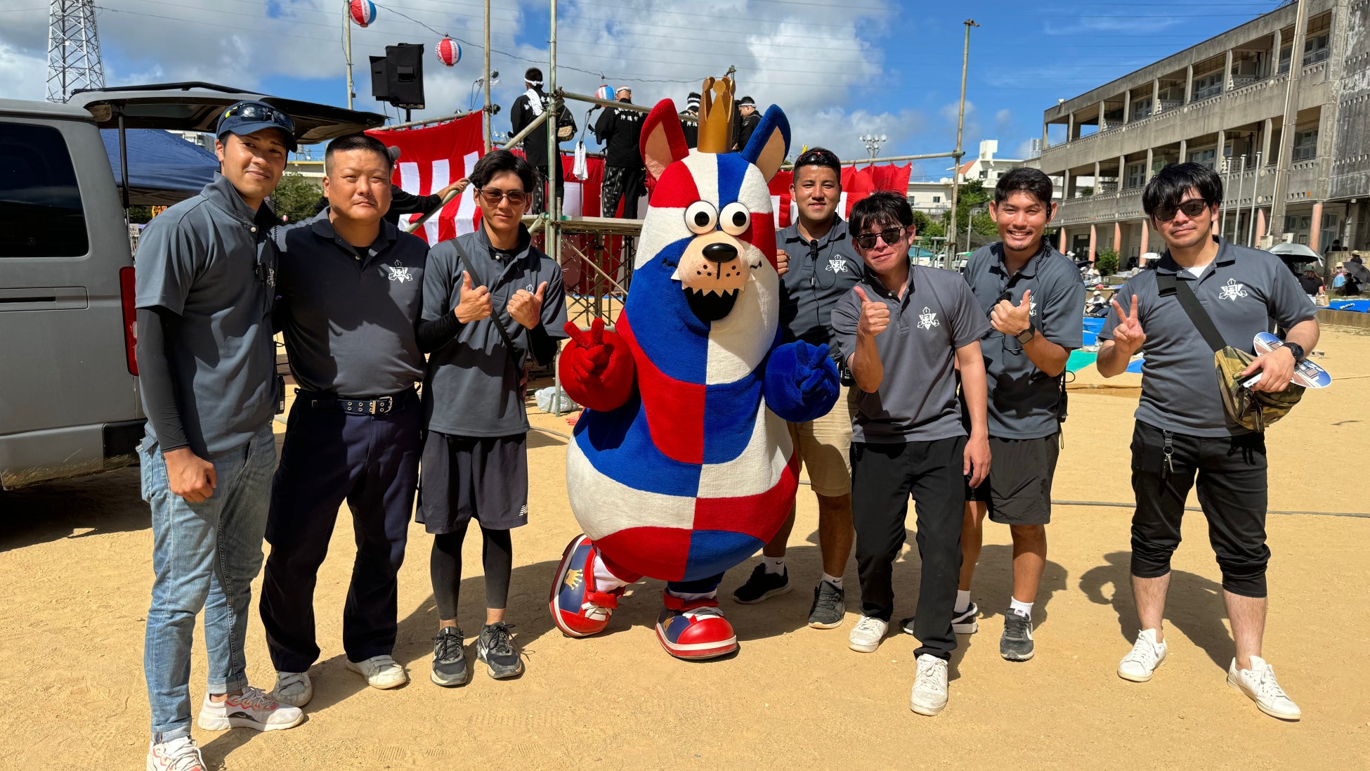 7月21日(日)では、ホームタウン沖縄市にある山内中学校のグランドで開催された「第22回風山祭」に参加しました。ゴーディーは開会式に登場し、祭りでエイサー演舞に出演する各団体の皆さまを激励しました。本祭りは、山内中学校区の5つの青年会を中心に構成される「風山の会」が主催となって開かれる祭りで、エイサー演舞やフラダンスなど、さまざまな催し物がありました。ゴーディーもエイサー演舞を鑑賞し、地域の皆さまと写真を撮ったりして、祭りを楽しみました。