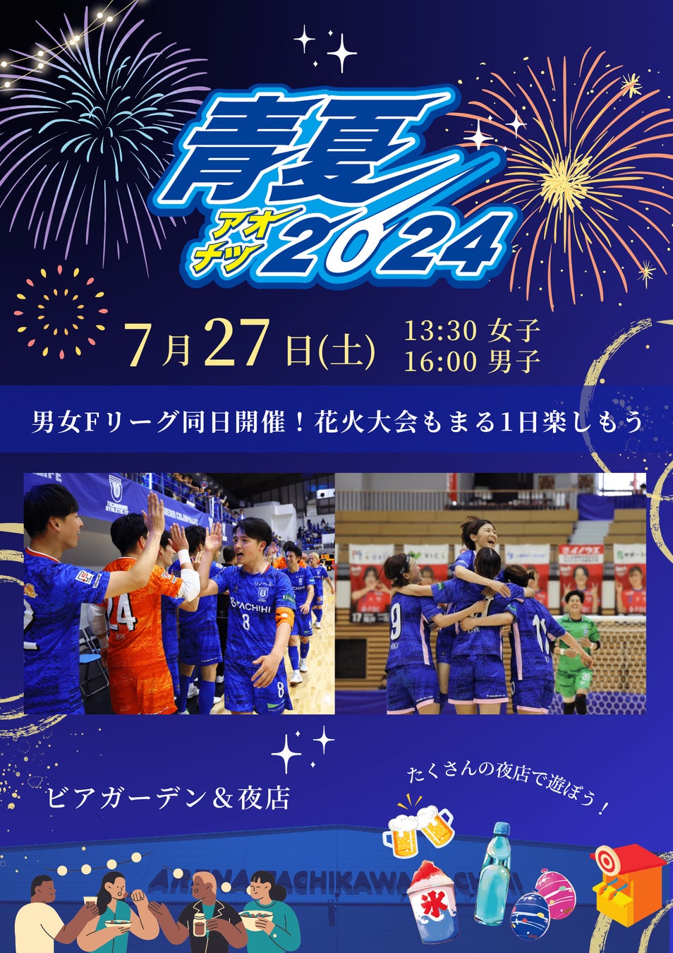 男女両カテゴリーのFリーグ共同開催に加え、ビアガーデンやマスコット選手権、縁日ブースの設置などイベント盛りだくさんの『青夏2024』に是非ご来場ください!
