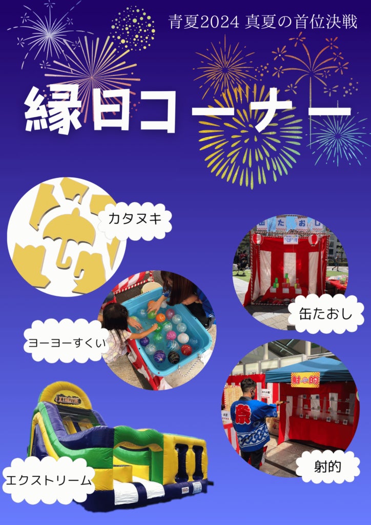 当日は縁日もコーナーも開催!試合後は射的、缶たおし、ヨーヨーすくい、カタヌキ、エクストリーム(遊具)で楽しもう!