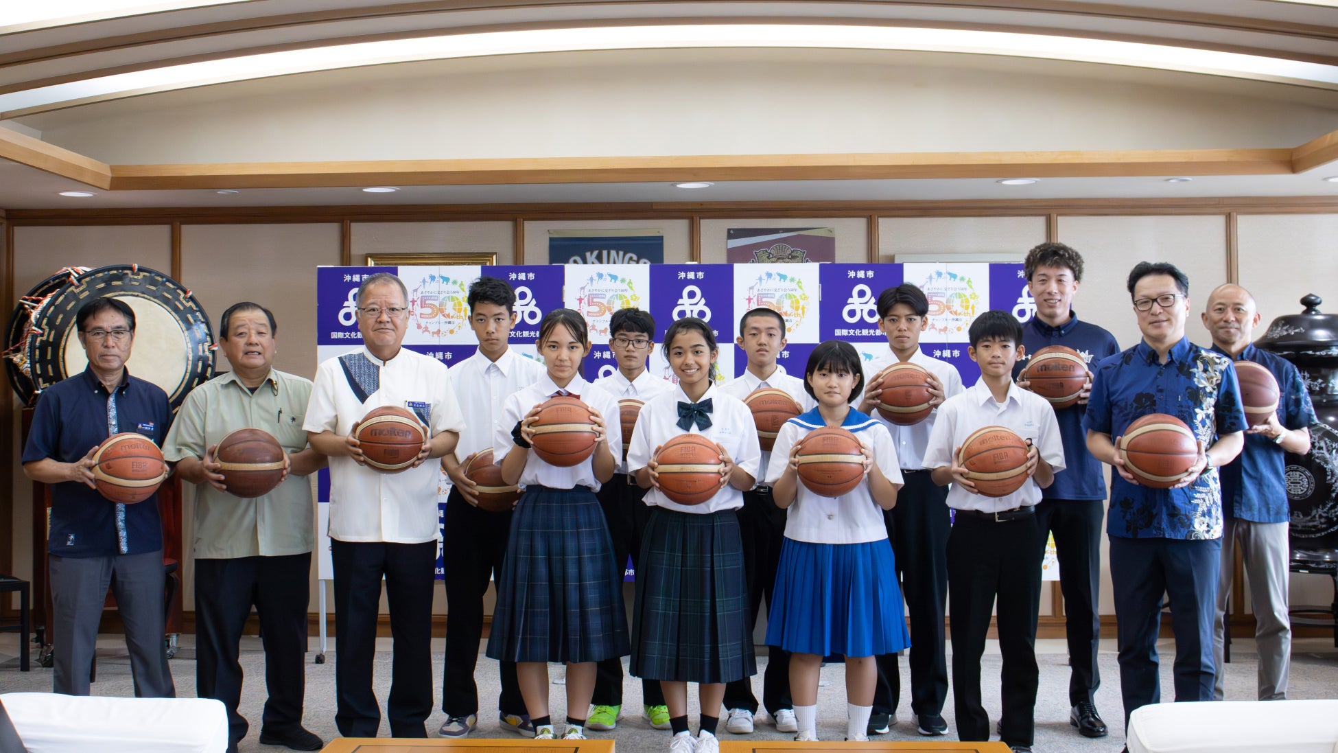 琉球ゴールデンキングスの皆さまは、過去には沖縄市内の小学3年生への「ドリームスタディドリル」の寄贈や、沖縄市内の公園へのバスケットボールリングのネット寄贈などにご協力いただいており、今回は昨年に引き続き沖縄市内の中学校へボールを寄贈していただきました。