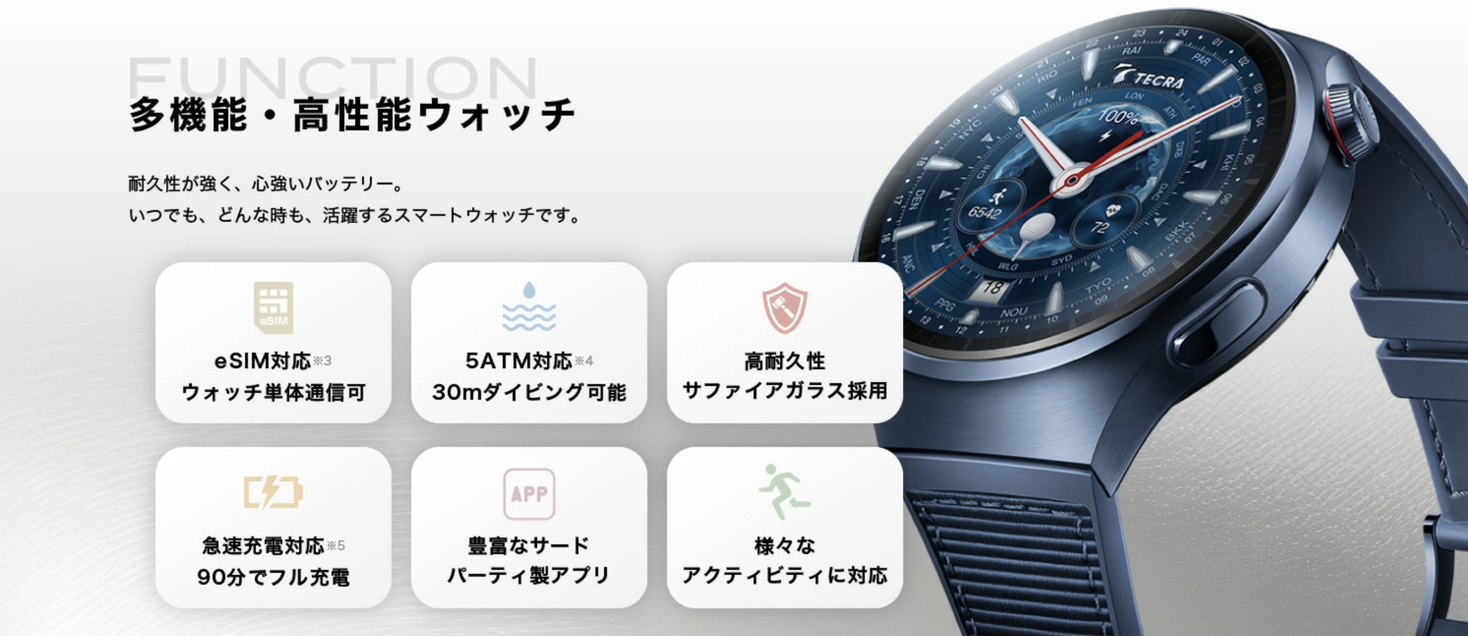 TECRAは日本未発売の「HUAWEI WATCH 4 Pro」をベースに、当社の既存ゴルフアプリを強化した「AiCADDY+」がプリインストールされています。ゴルフプレー時はもちろん、バイタル情報なども取得可能です。毎日使える多機能・高性能スマートウォッチとなっています。