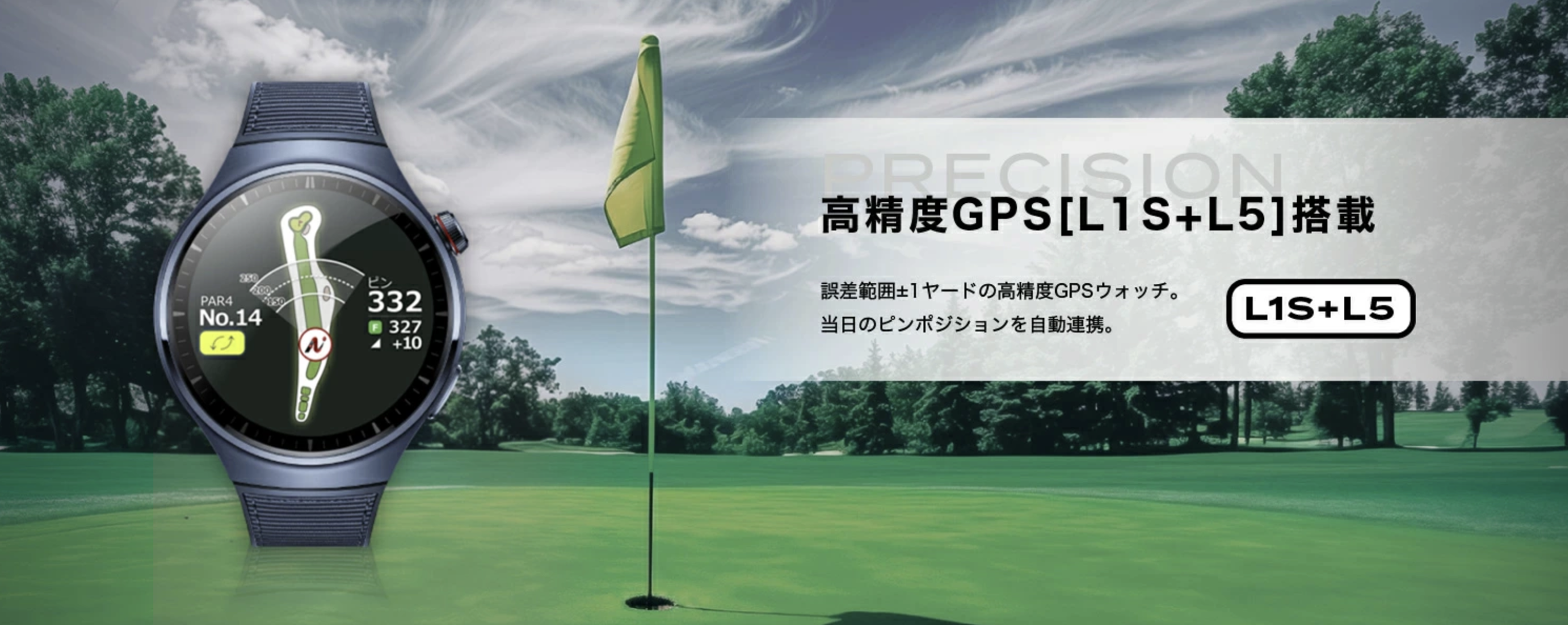 TECRAはL1S+L5の高精度2周波GPSによる位置情報取得が可能なスマートウォッチです。誤差範囲±1ヤード(※1)の正確さで位置情報を把握できます。また、当社のゴルフカートナビシステム導入コースであれば当日のピンポジションを自動連携しますので、手間なく、精度の高い情報を手元のデバイスひとつで取得できます。