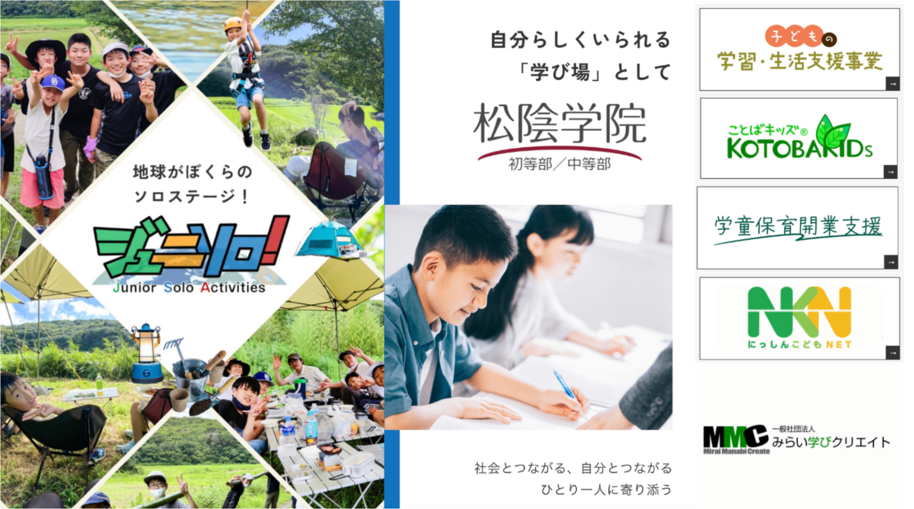 一般社団法人みらい学びクリエイトは幼児から高齢者までが育ち合い、幸せに暮らせる地域づくりの実現に寄与することを目的としています。子どもたちに向けては、これからの時代に必要とされる「自立」心と「探究」心を育むプログラムを行なっています。主には学童保育キッズデイズ、フリースクール松陰学院、ジュニソロで子どもたちの未来を創る学び場として、探究に関するプログラムを頻繁に行なっています。