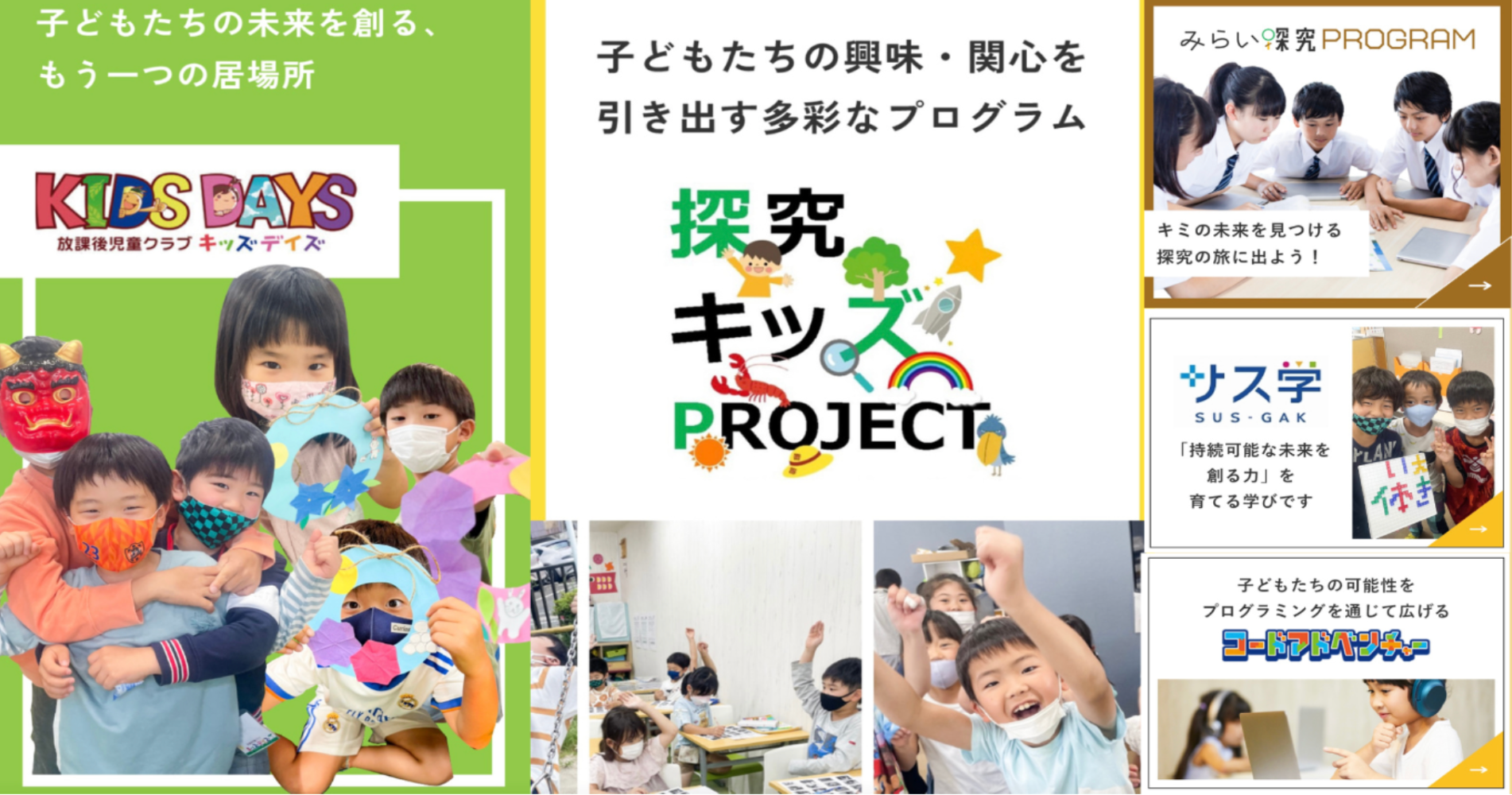 子どもたちの未来を創る、もう1つの 「居場所」笑う。伝える。聞く。ほめる。時に、叱る。体験する。引き出す。見守る。伸ばす。そして、育む。キッズデイズで過ごす時間の中で、子どもたちは、探究心や感性、創造力を伸ばし、様々なプログラムを体験する中で、自らの個性や興味にあった、夢中になれるものに出会います。自分で考え、主体的に行動できる力を身につけ、子どもたちの将来の可能性を引き出し、広げる。そんな場をキッズデイズはつくり続けます。