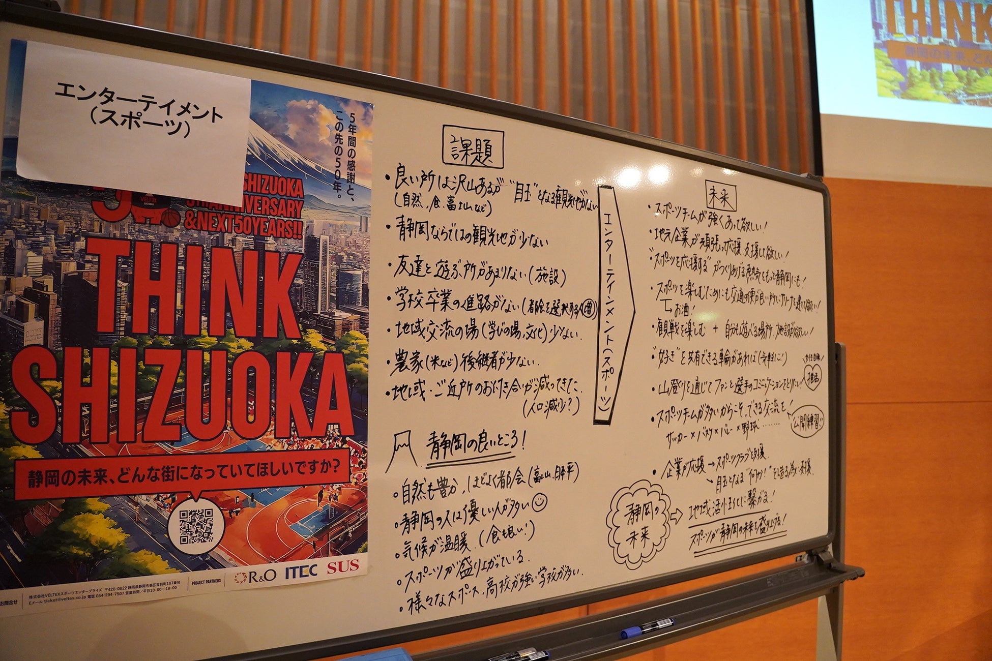 10代から60代の40名の参加者が5つのグループに分かれ、「健康・食」「教育」「エンターテイメント・スポーツ」「観光」「仕事」5つのテーマに沿った静岡の現在の課題や未来について意見交換を行いました。