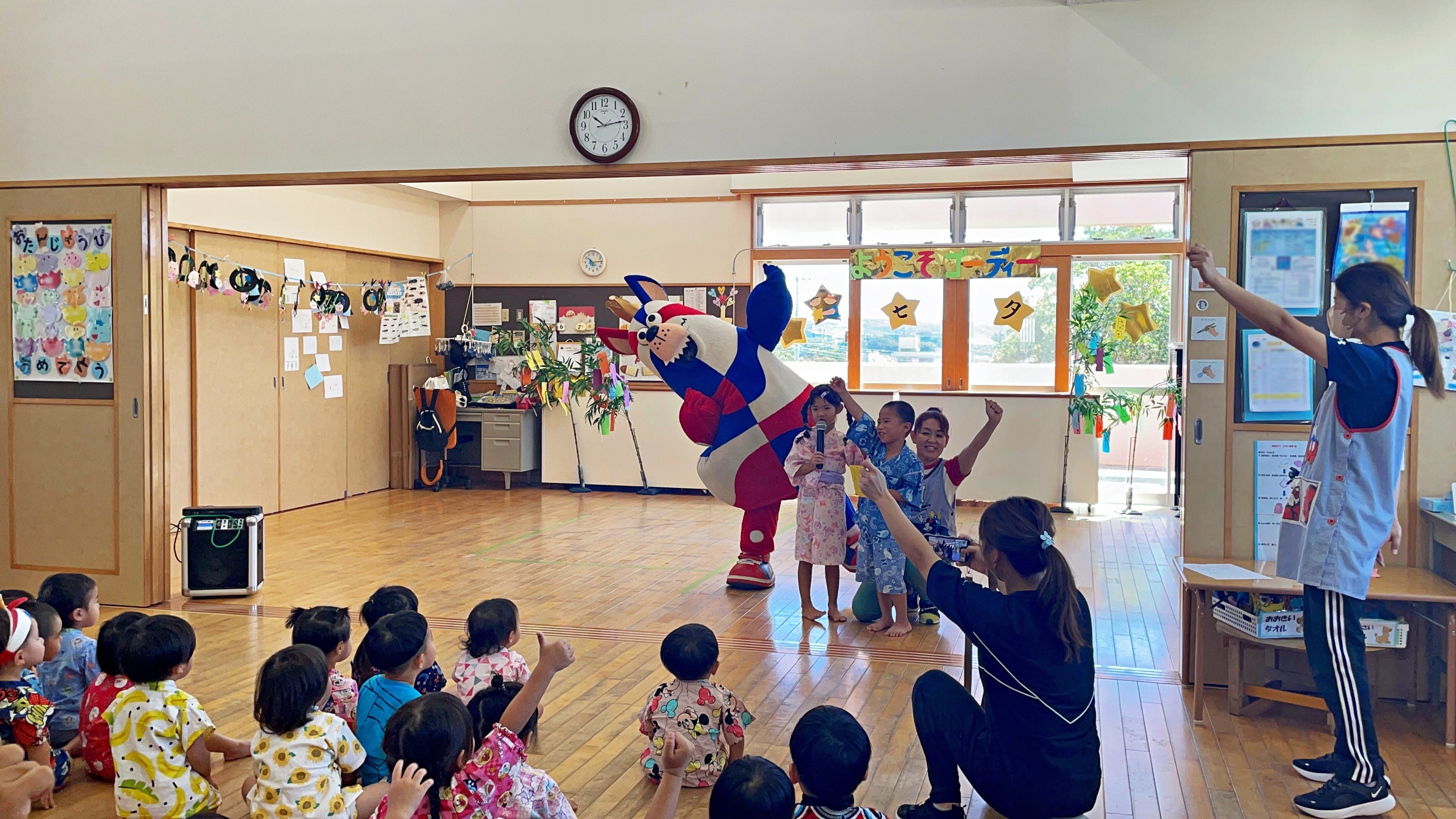 また、保育園の七夕イベントにゴーディーがスペシャルゲストとして参加しました。各クラスの子どもたちの短冊の願いを聞いたり、パネルシアターや、星探しゲームを行いました。たくさんのクラスの子どもたちと触れ合いながら一緒に体験ができました。