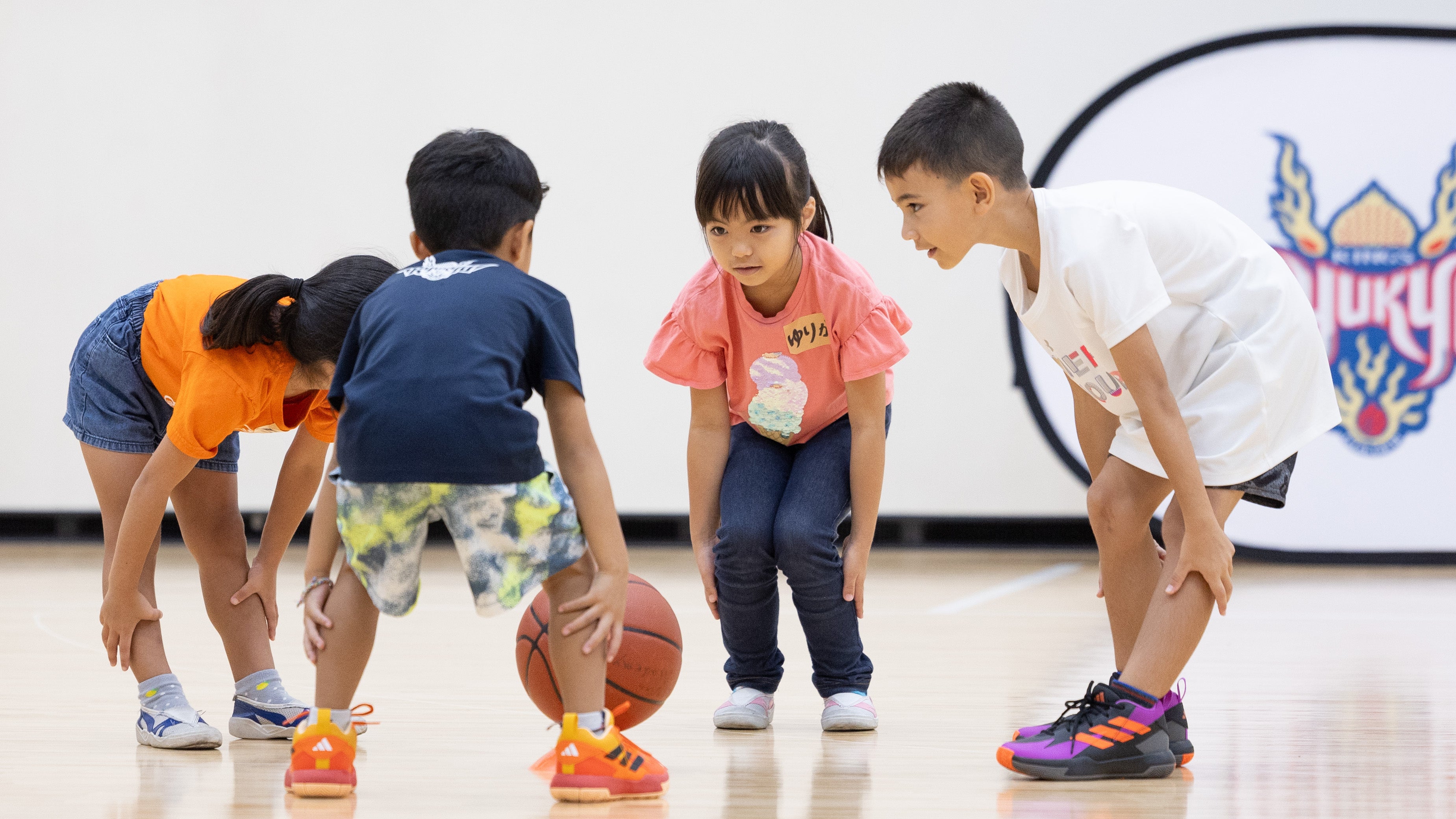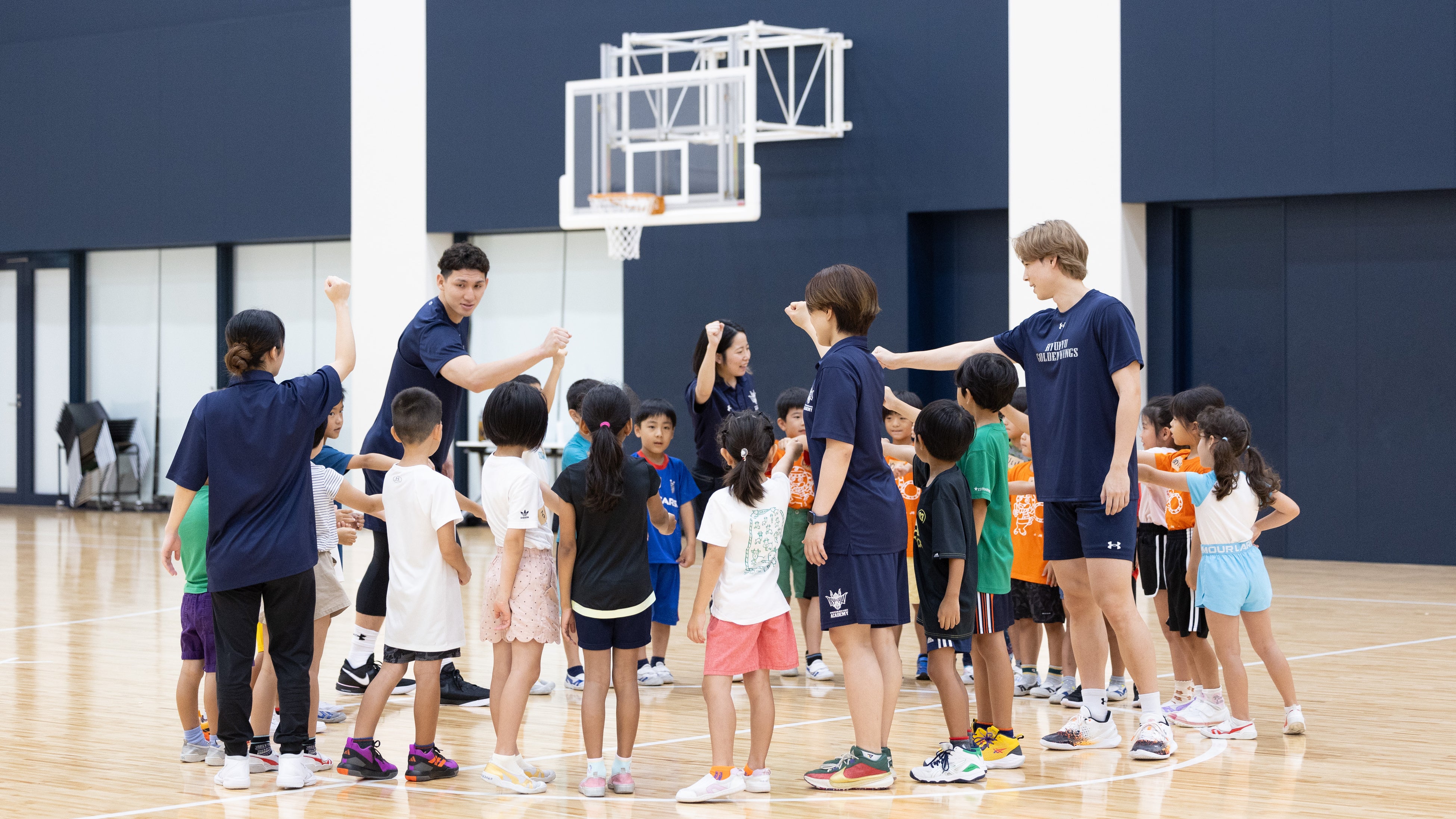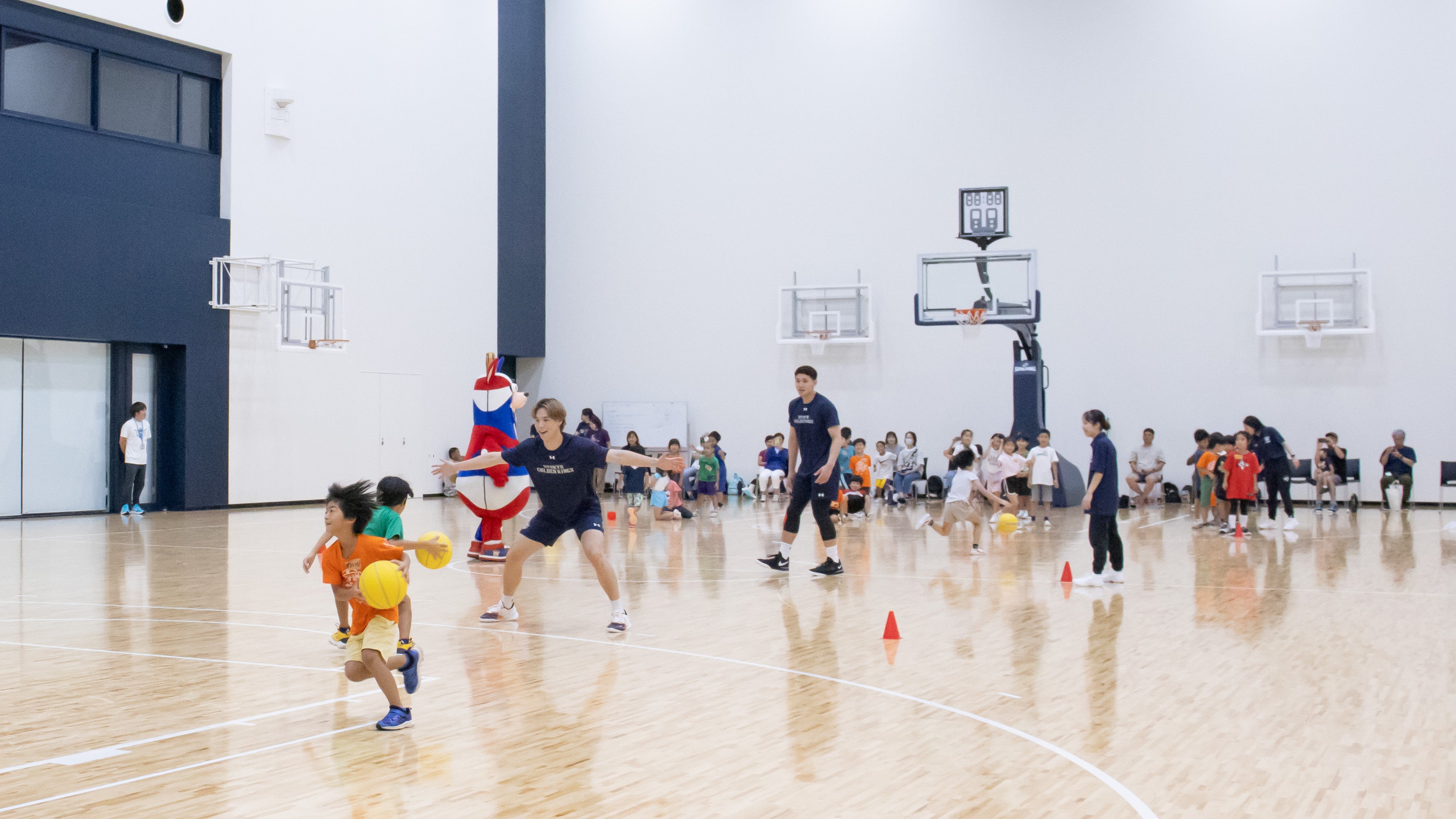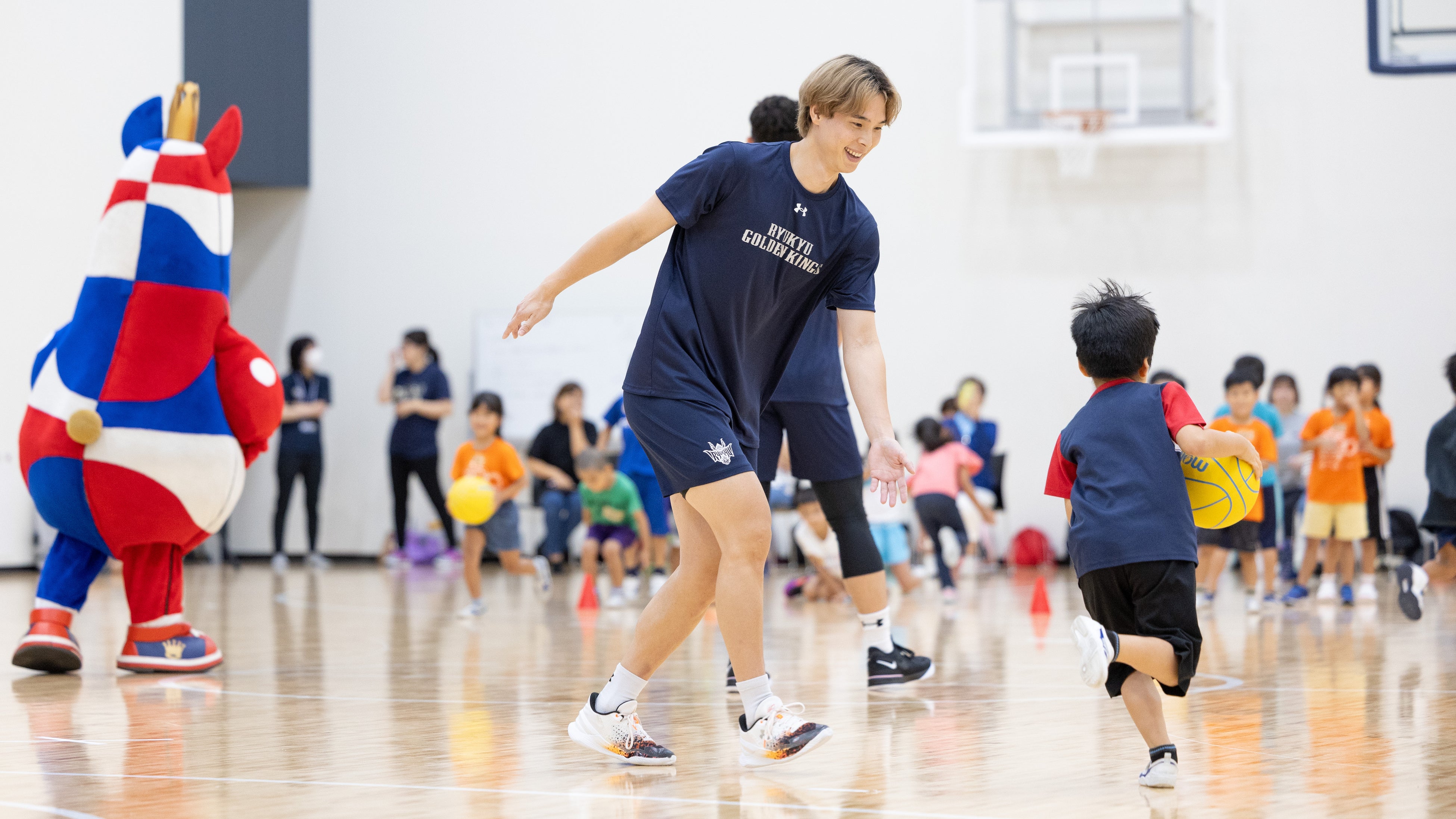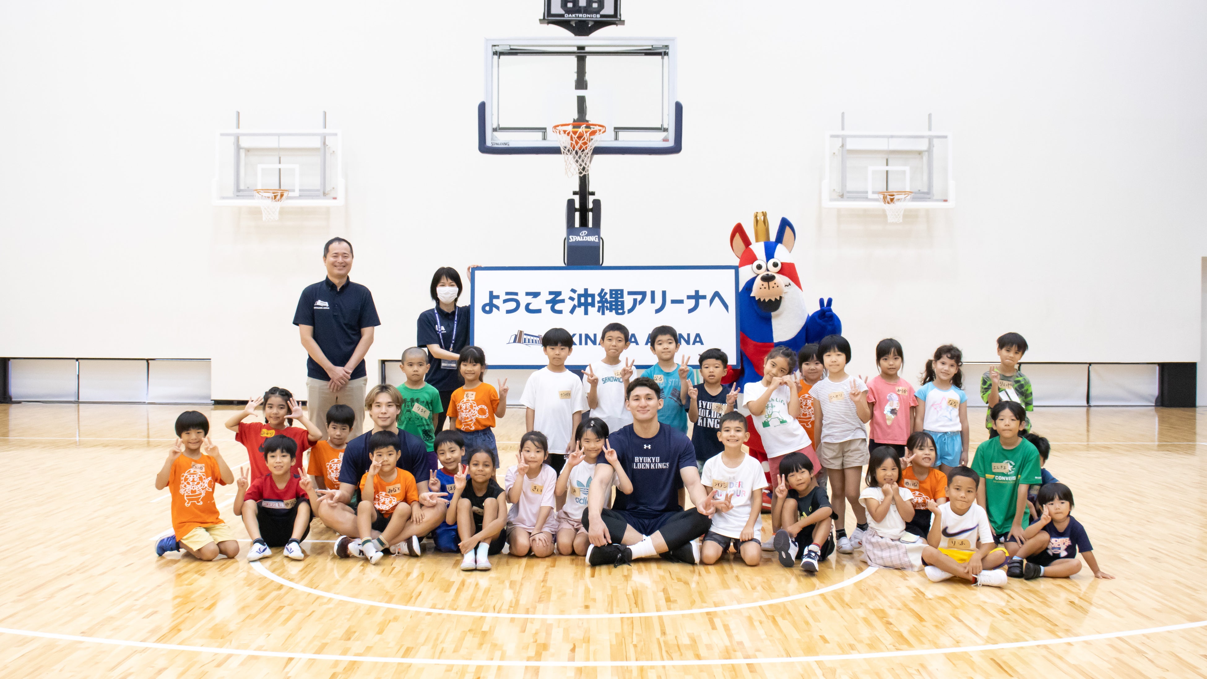 今回のサタデースポーツ教室は、夏休みにより多くの子どもたちに参加していただくことを目的に「体験学習施設やまっち」と「福祉文化プラザ児童センター」と合同で開催し、小学1〜3年生合計26名にご参加いただきました。また、キングスアカデミーのコーチが指導にあたったほか、琉球ゴールデンキングスの#8 植松義也選手、#10 荒川颯選手、キングスのマスコットキャラクター「ゴーディー」と、沖縄アリーナ株式会社からは片野竜三取締役が参加しました。