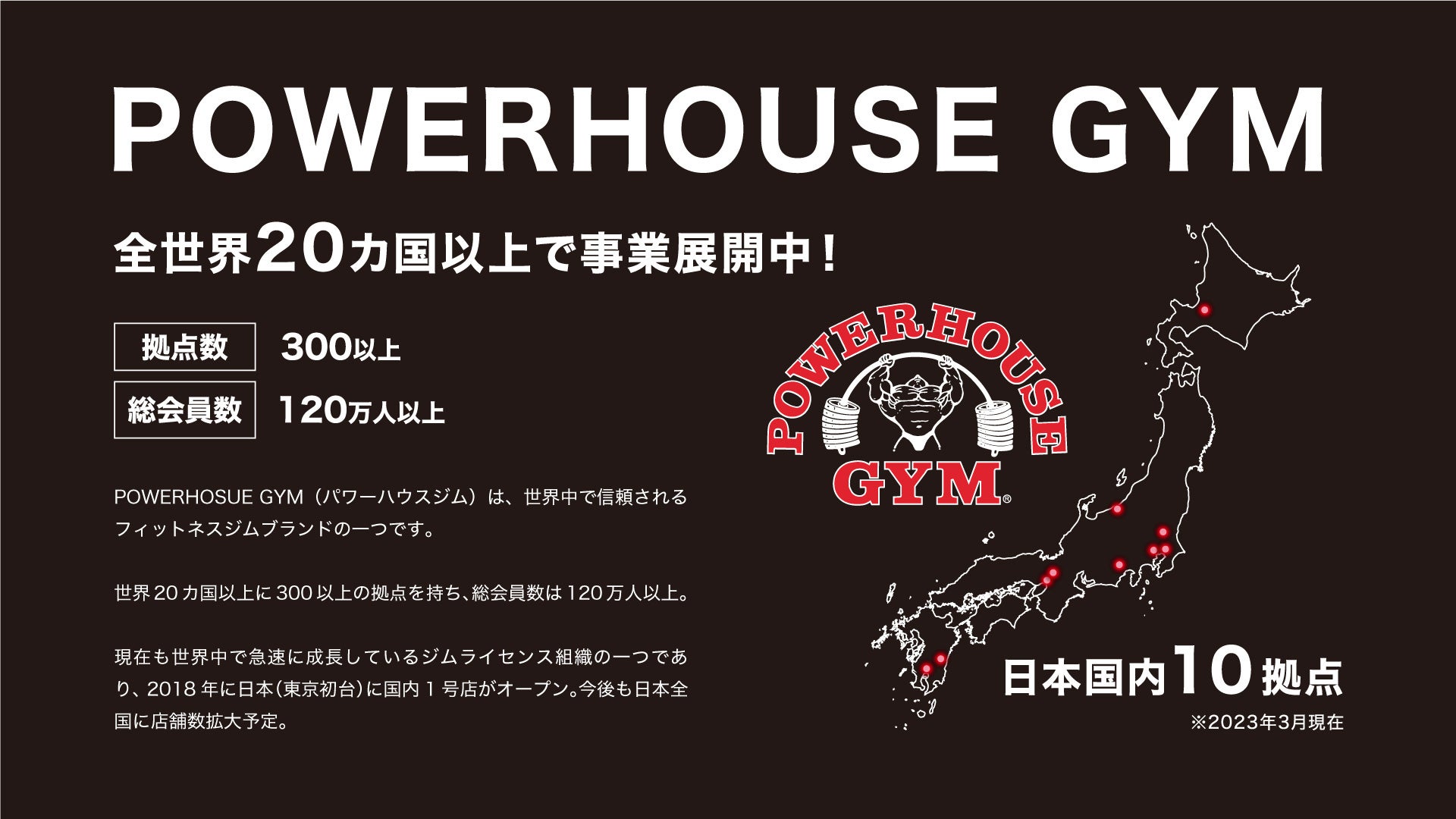 1974年にアメリカミシガン州ハイランドパークにて誕生し、今年で創立50周年を迎えるPOWERHOUSE GYM(パワーハウスジム)は、世界中で信頼されるフィットネスジムブランドの一つです。世界20カ国以上に300以上の拠点を持ち、総会員数は120万人以上。現在も世界中で急速に成長しているジムライセンス組織の一つであり、2018年に日本(東京初台)に国内1号店がオープン。2024年7月現在で10店舗を展開。今後も日本全国に店舗を拡大していきます。