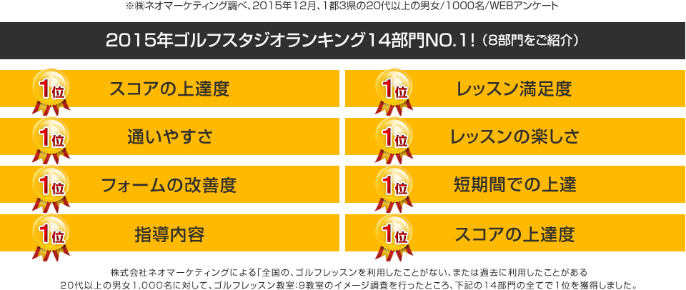 「5ラウンド以内にスコア100が切れなければ全額返金」というユニークな独自サービスを展開しており、1,000人による意向調査で、ゴルフスタジオランキング14部門でNo.1に輝いた(※)ゴルフレッスンスクールです。
