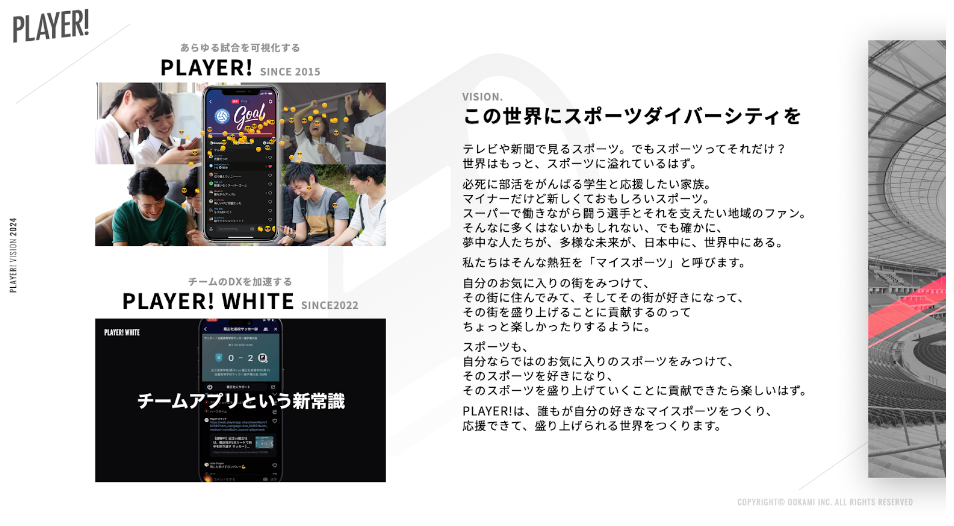 私たちookamiは、「スポーツで一つの笑顔を世界に」をミッションに掲げています。地元スポーツチームの潜在価値を最大化して、本当に大事なことにもっと多くの時間を使えるようにしたいと考え、「Player! WHITE」を提案してきました。現在、200以上のチームに導入いただいており、今後さらなる拡大を目指していきます。