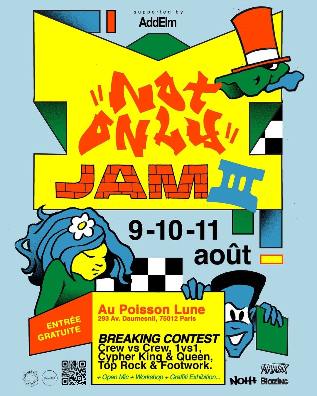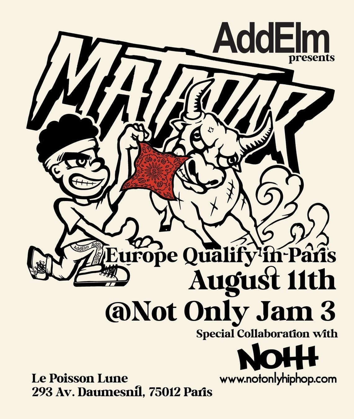 今夏世界から人が集まる「パリ」で8月9〜11日(金〜日)に行われる「Not Only JAM Ⅲ」イベントにAddElmがスポンサード協賛をいたします。また、イベント内のコンテンツの一つとして、11月のLA本戦へのBEST16のシード権をかけた「MATADOR Qualify in Paris」を実施いたします。8月11日の「ヒップホップ記念日」をヒップホップフリークとお祝いするために行われるこのイベントはヒップホップの4大要素である、「ラップ、DJ、ダンス、グラフィティー」の要素を体感できるイベントとなっています。AddElmとしても大切にしているこのカルチャーの価値向上に貢献していきます。