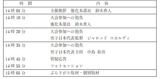 発表会では、強化本部長、男子日本代表監督、主将が、大会参加に向けて意気込み等を語ります。