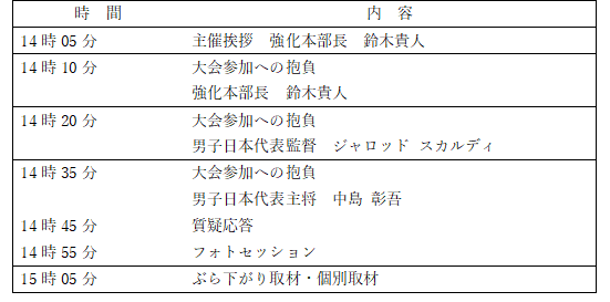 発表会では、強化本部長、男子日本代表監督、主将が、大会参加に向けて意気込み等を語ります。