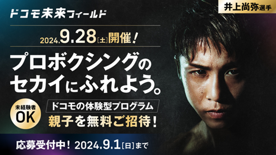 株式会社NTTドコモ(以下、ドコモ)は、井上尚弥選手および大橋ボクシングジムの全面協力のもと、ドコモ未来フィールド「井上尚弥選手&大橋ボクシングジム 特別体験イベント」を2024年9月28日(土)に開催いたします。