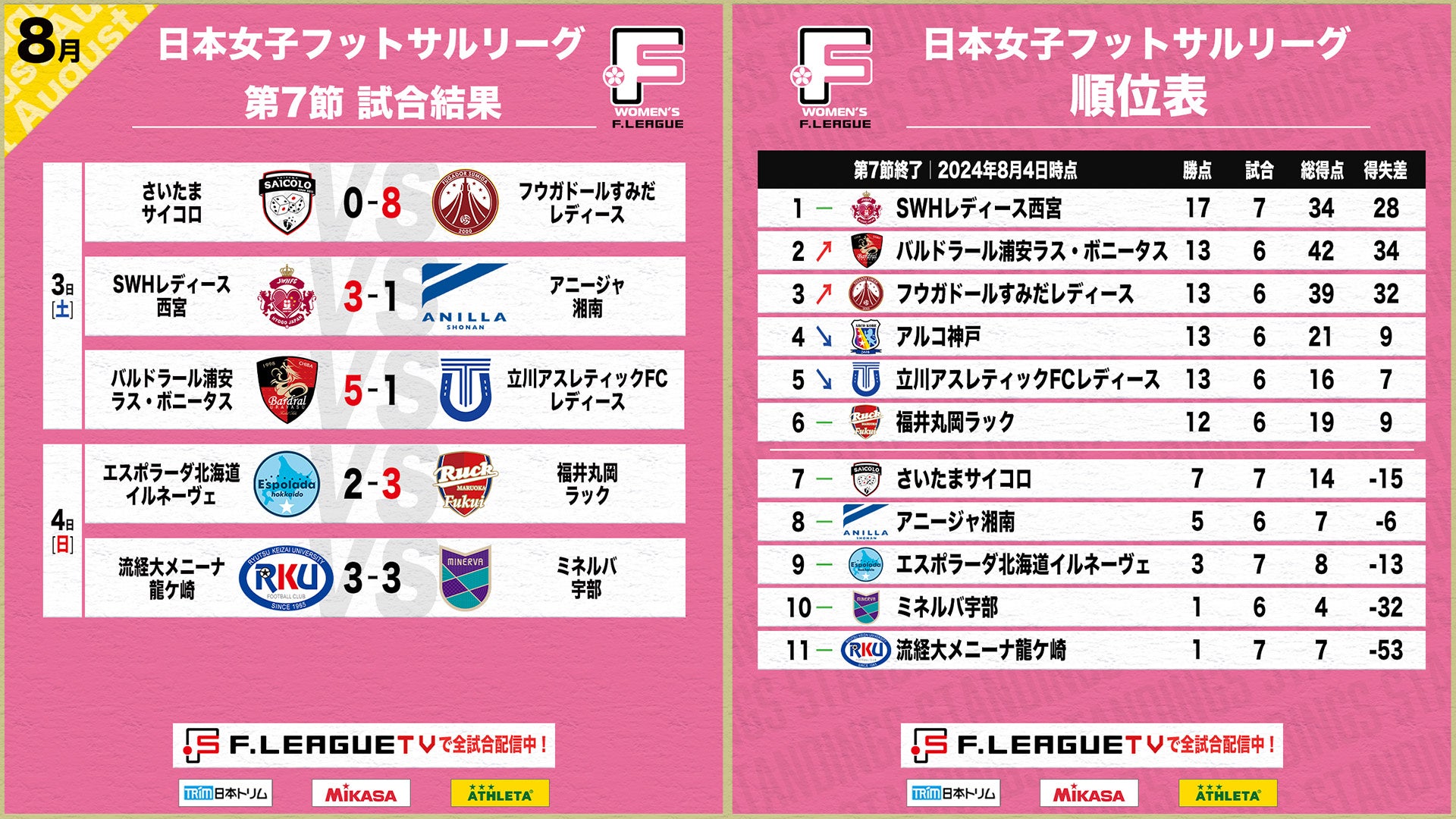 8月3日(土)・4日(日)の3日間で実施された女子Fリーグ2024-2025 第7節の5試合について結果をお知らせいたします。