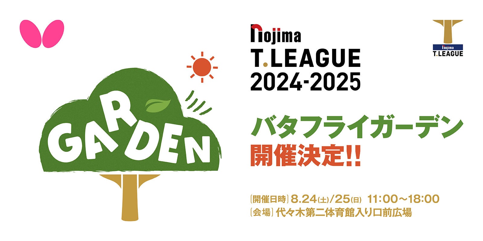 Tリーグでは、2024年8月24日(土),25日(日)に代々木第二体育館にて行われる、ノジマTリーグ 2024-2025シーズン 開幕戦の会場の外にて、人気のキッチンカーが集合するフードコートや、パブリックビューイング、各種ブースが展開される「バタフライガーデン」を開催します。