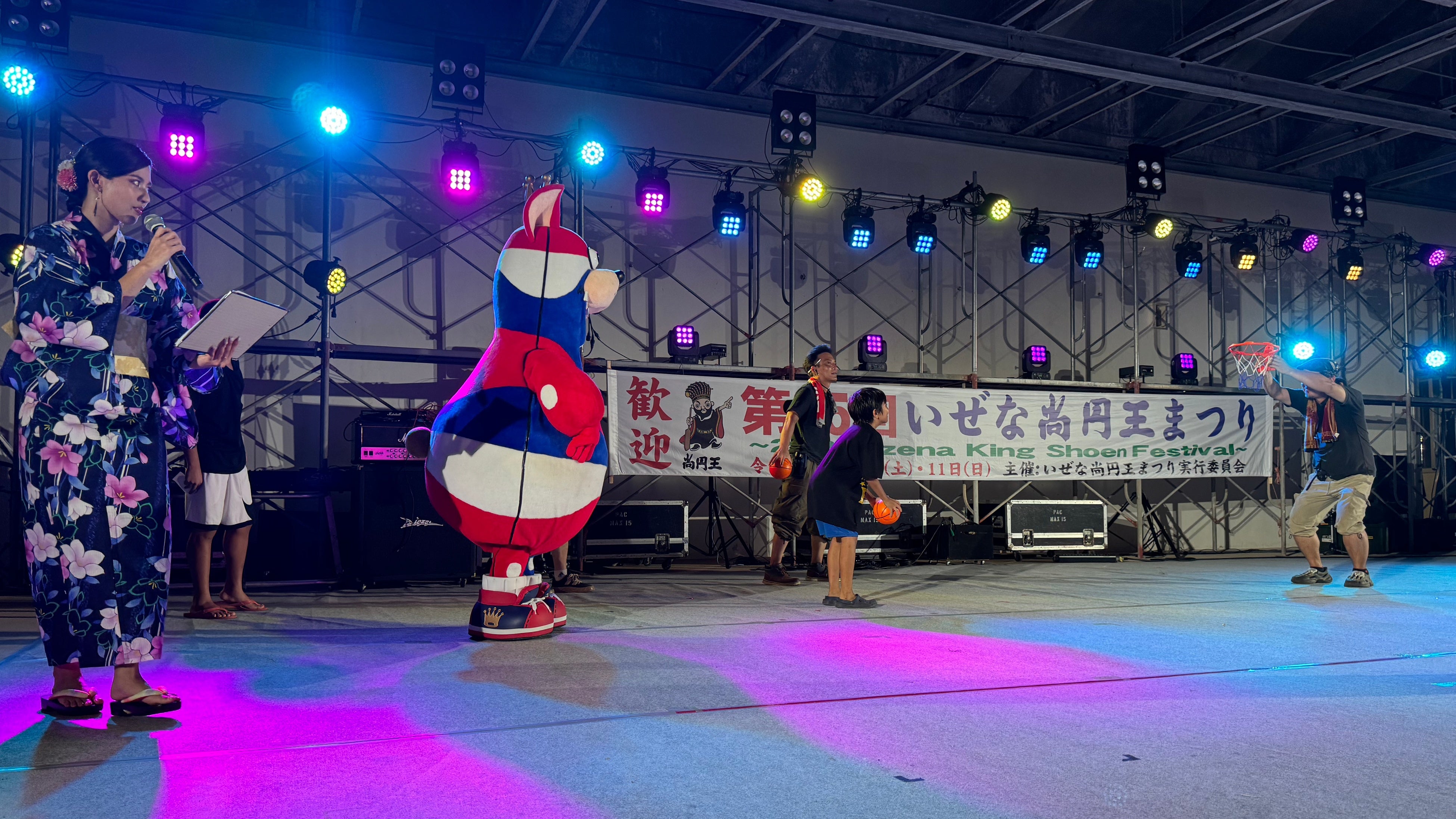 8月10日(土)に参加した伊是名島の「第25回いぜな尚円王まつり」では、ゴーディーがフリースローコーナーに参加し、子どもたちの応援や、フリースローに挑戦しました。ゴーディーの登場時には、大きなゴーディーコールで迎えられ、お祭り会場を沸かせました。お祭りには、伊是名島の地域の方や沖縄本島からもお客さまが来場し、多くの方々と交流することができました。