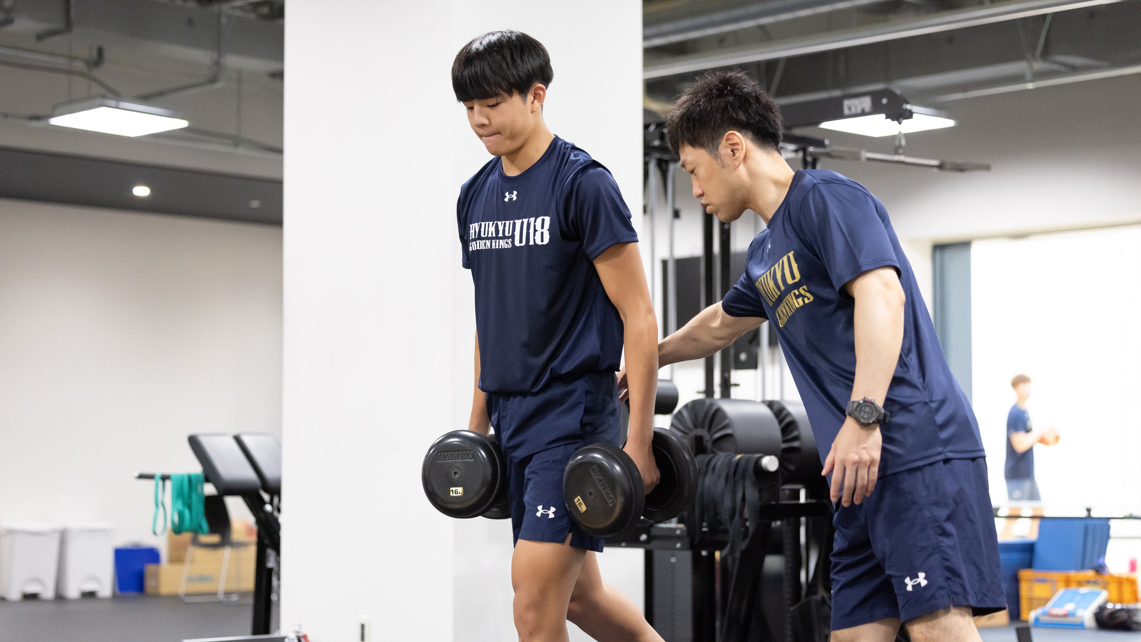 キングスU15所属で現在キングスU18で活動している#29 宮里俊佑選手とキングスU18の#77 佐取龍之介選手が、夏休みの期間を利用して定期的にトップチームのワークアウトに参加しました。