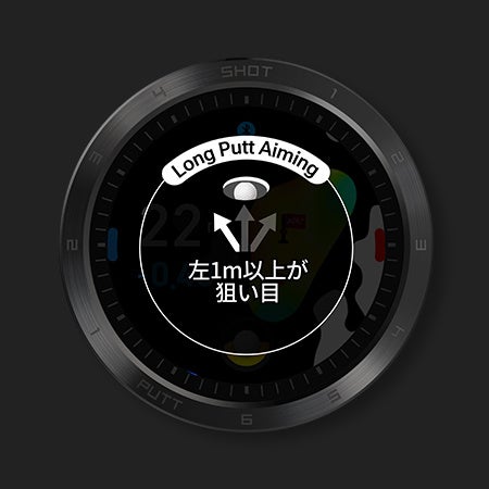 ■ロングパットガイド:5m以上のパッティングの際、カップの左右どちらにどれくらい狙えばいいか推奨してくれる