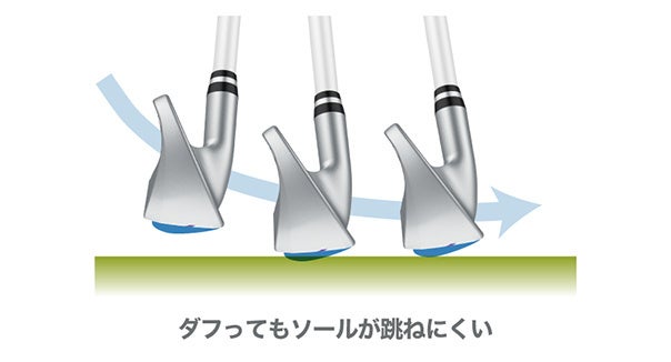 ヤマハが独自開発したレールが段階的に接地し、摩擦が減少。レール効果によりダフってもソールが滑り、ミスを大幅に軽減します。
