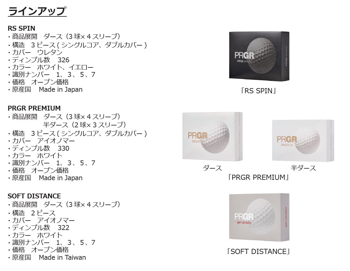(株)プロギアは、スピン性能とソフトなフィーリングを追求したツアースペックボール「RS SPIN(アールエス・スピン)」、「飛び」と「打感」を追求したプレミアムディスタンスボール「PRGR PREMIUM(プロギア・プレミアム)」、ソフトな打感のディスタンスボール「SOFT DISTANCE(ソフト・ディスタンス)」を9月13日から発売します。スピン系1種とディスタンス系2種のラインアップで幅広いゴルファーのニーズに応えます。